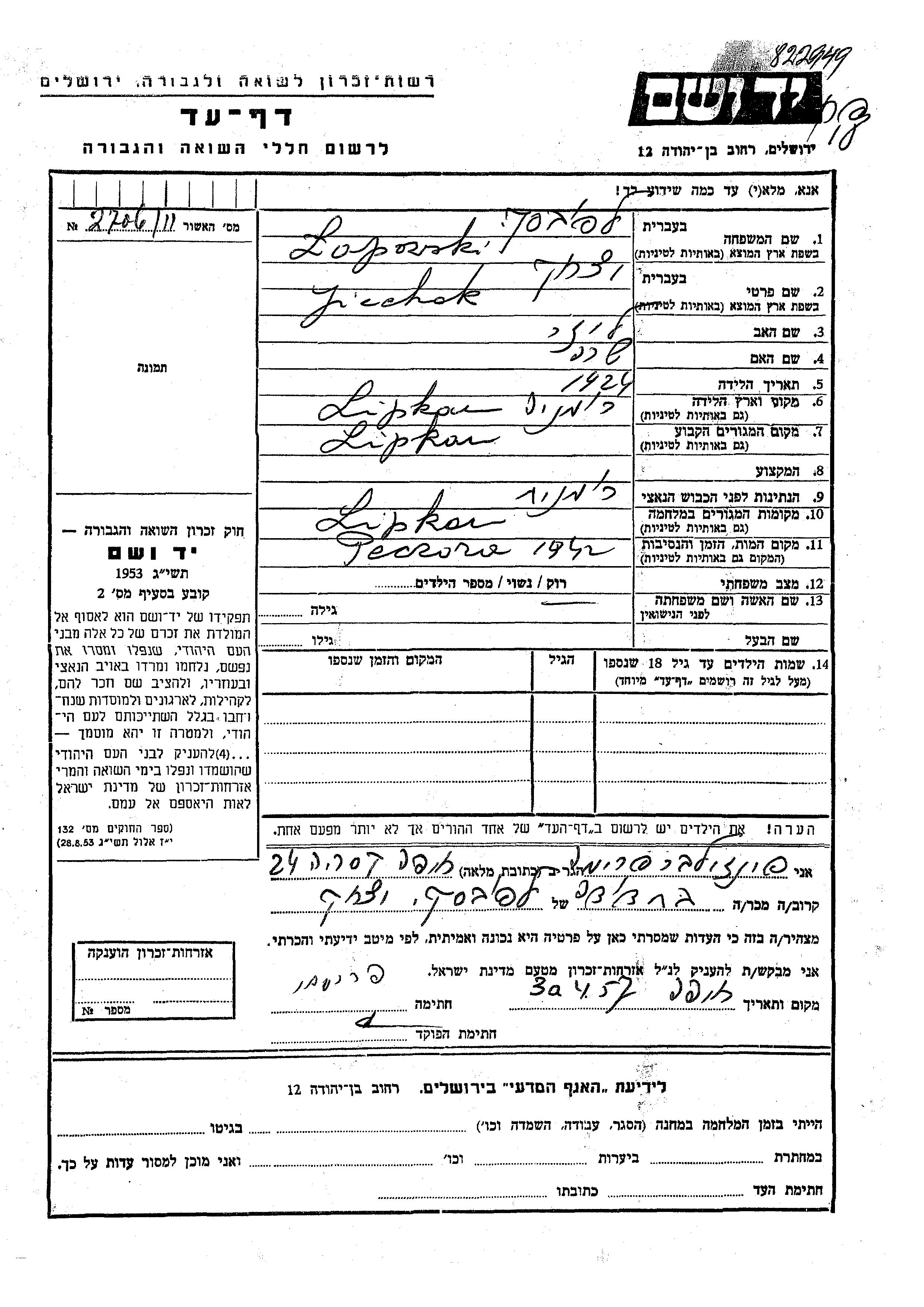 Lopovski Jicchak 1924 Lipkani, Rumänien Gedenkblatt