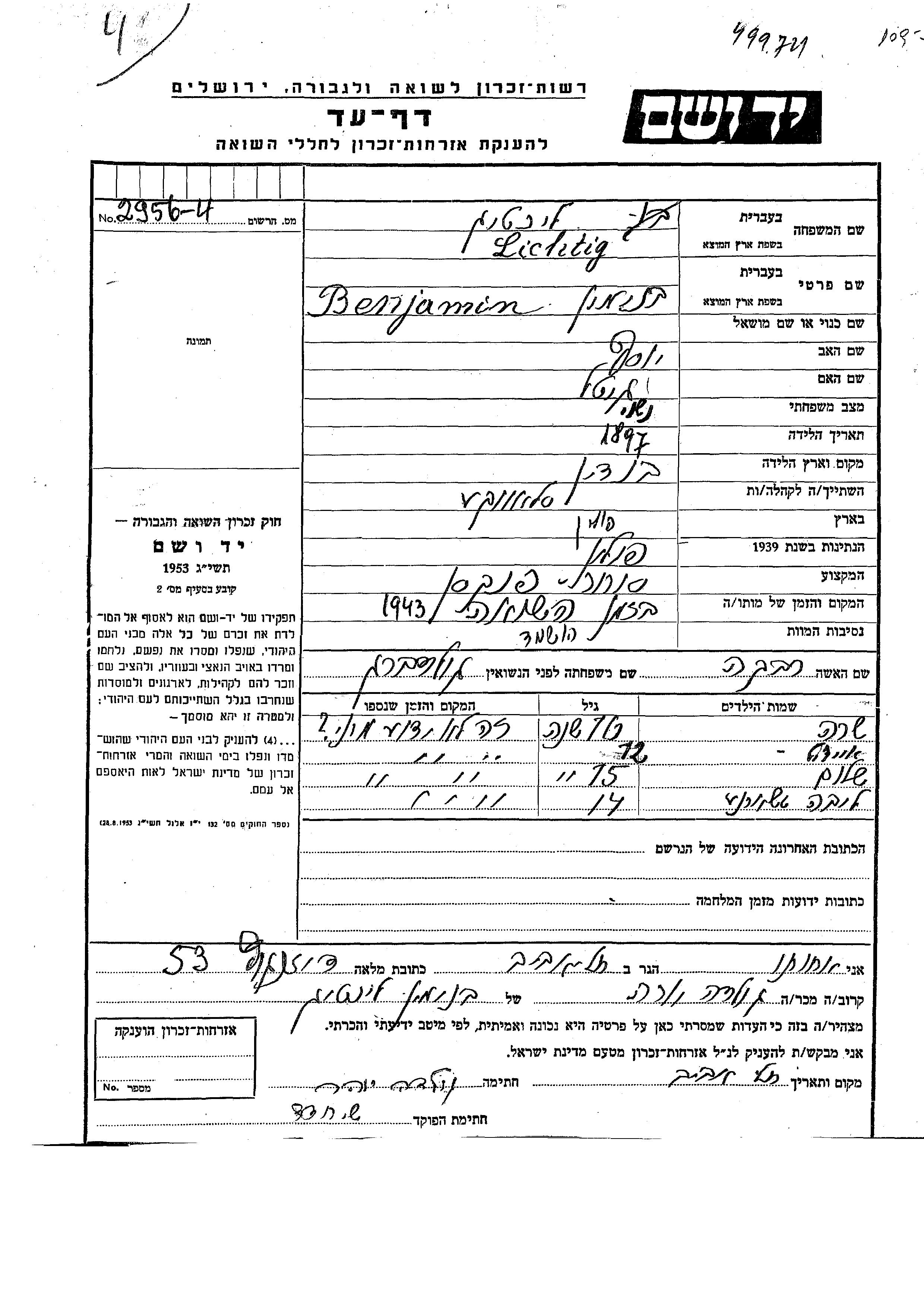 Benjamin Lichtig wurde im Jahr 1897 in Bendin, Polen geboren. Er war der Sohn von Yosef und Gitel. Er war Buchhalter/-in und mit Rivka, geb. Goldberg Verheiratet.