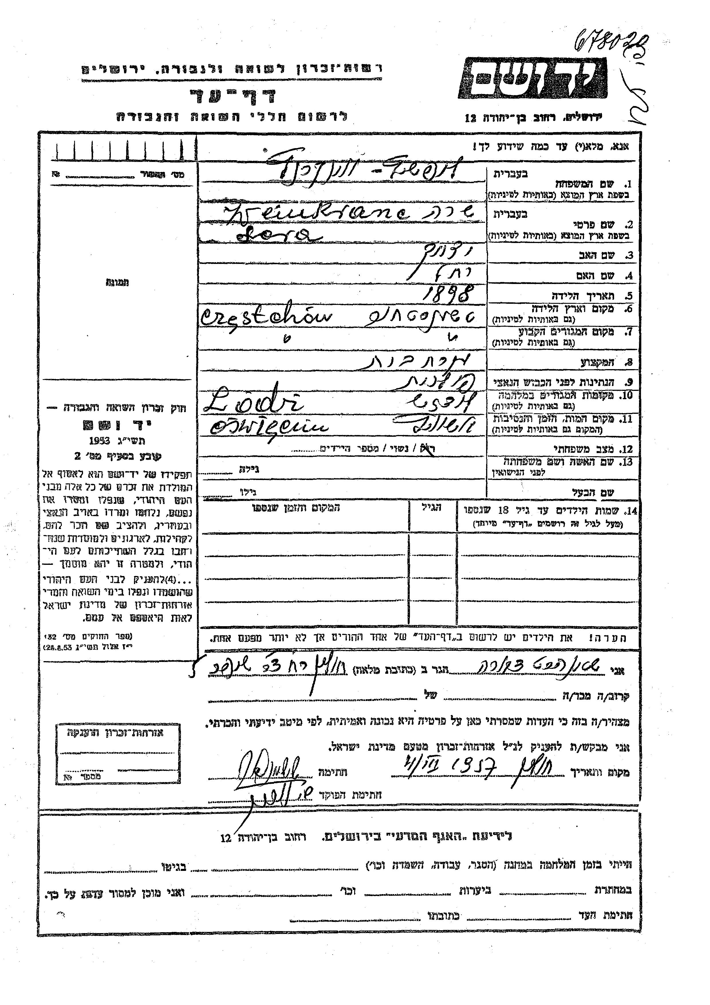 Sara Weinkranc Lufshitz wurde im Jahr 1898 in Czestochow, Polen geboren. Sie war die Tochter von Yitzkhak und Rakhel. Sie war Hausfrau und Verheiratet. Vor dem Zweiten Weltkrieg lebte sie in Czestochow, Polen. Während des Krieges war sie in Lodz, Polen.