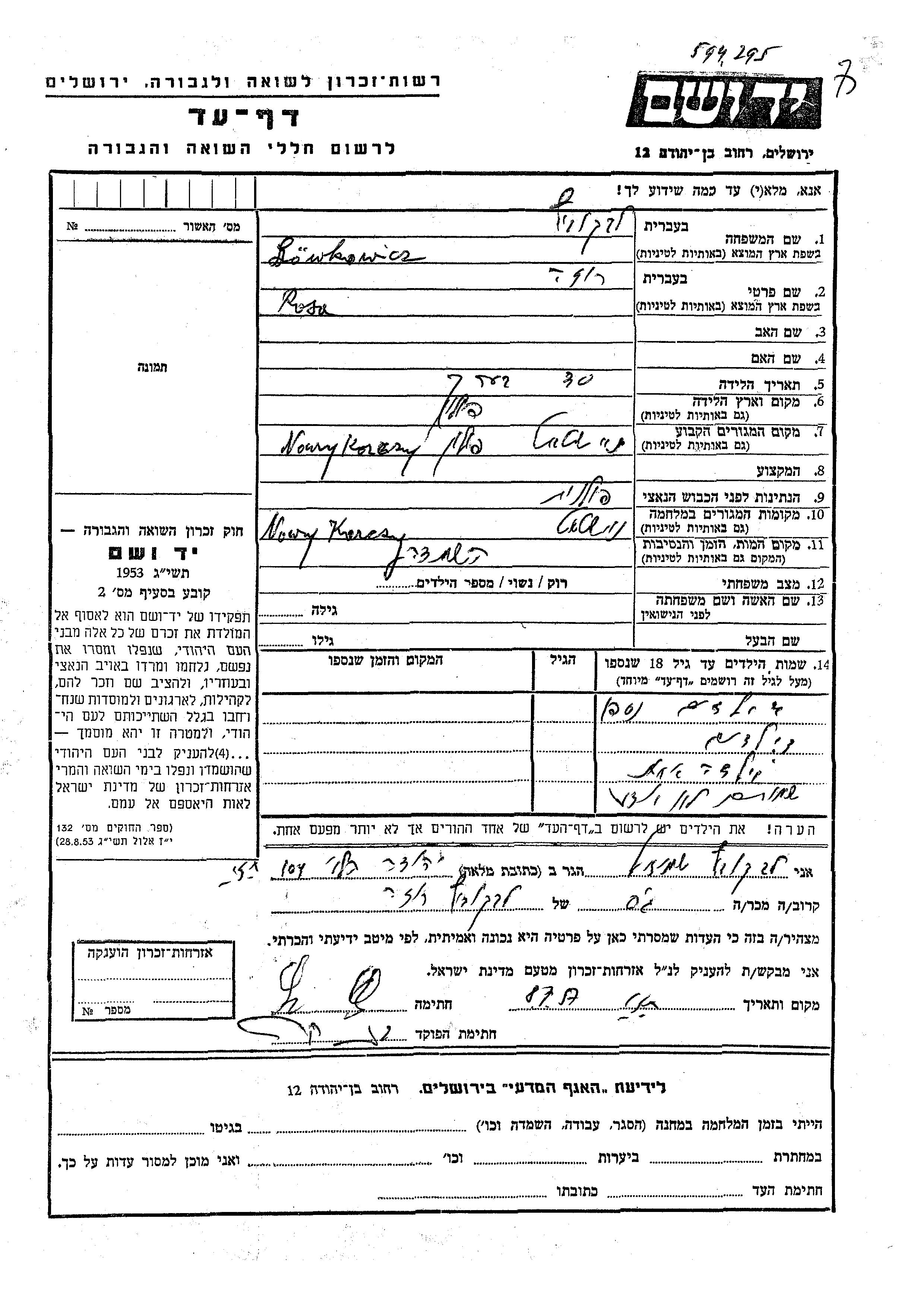 Rosa Lowkowicz wurde in Polen geboren. Vor dem Zweiten Weltkrieg lebte sie in Nowy Korczyn, Polen. Während des Krieges war sie in Nowy Korczyn, Polen.