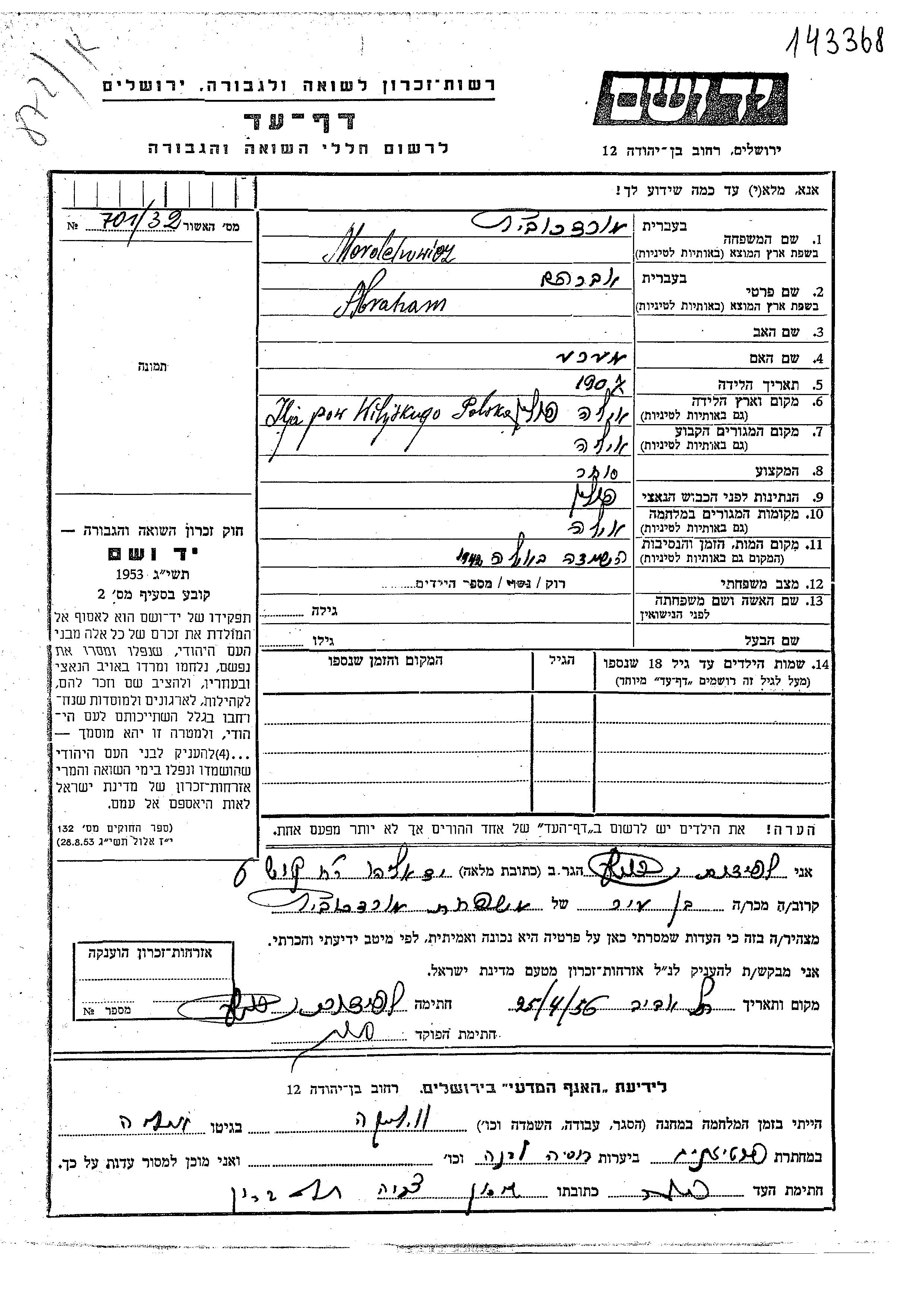 Abraham Mordehowicz wurde im Jahr 1907 in Ilja, Polen geboren. Er war der Sohn von Miriam. Er war Kaufmann/-frau und Ledig. Vor dem Zweiten Weltkrieg lebte er in Ilja, Polen. Während des Krieges war er in Ilja, Polen.
