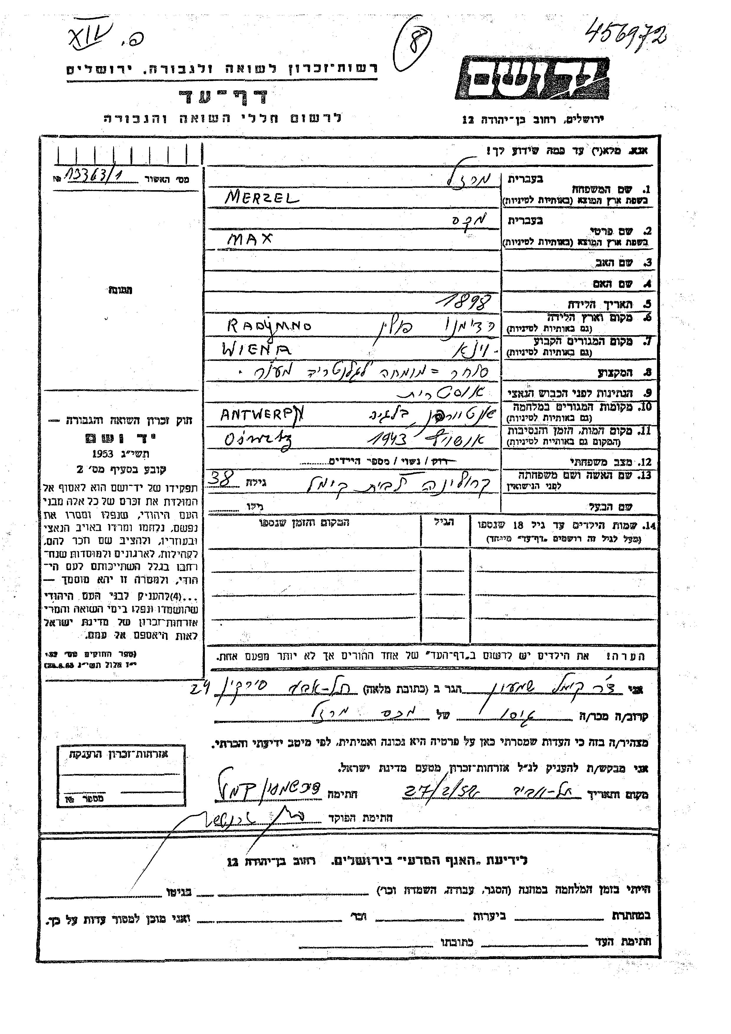 Max Merzel wurde im Jahr 1898 in Radymno, Polen geboren. Er war Lederhändler/-in und mit Karolina, geb. Kimel Verheiratet. Vor dem Zweiten Weltkrieg lebte er in Wien, Österreich. Während des Krieges war er in Antwerpen, Belgien.