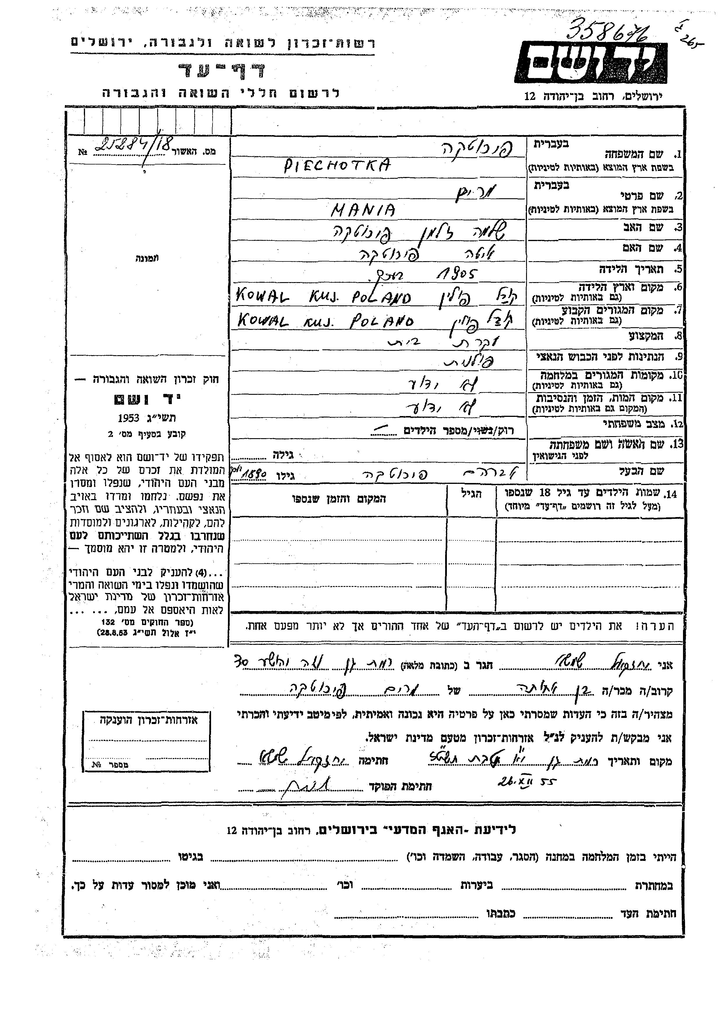 Mania Miriam Piechotka, geb. Piechotka wurde im Jahr 1905 in Kowal, Polen geboren. Sie war die Tochter von Shlomo Zalman und Ita. Sie war Hausfrau und mit Avraham Verheiratet. Vor dem Zweiten Weltkrieg lebte sie in Kowal, Polen.