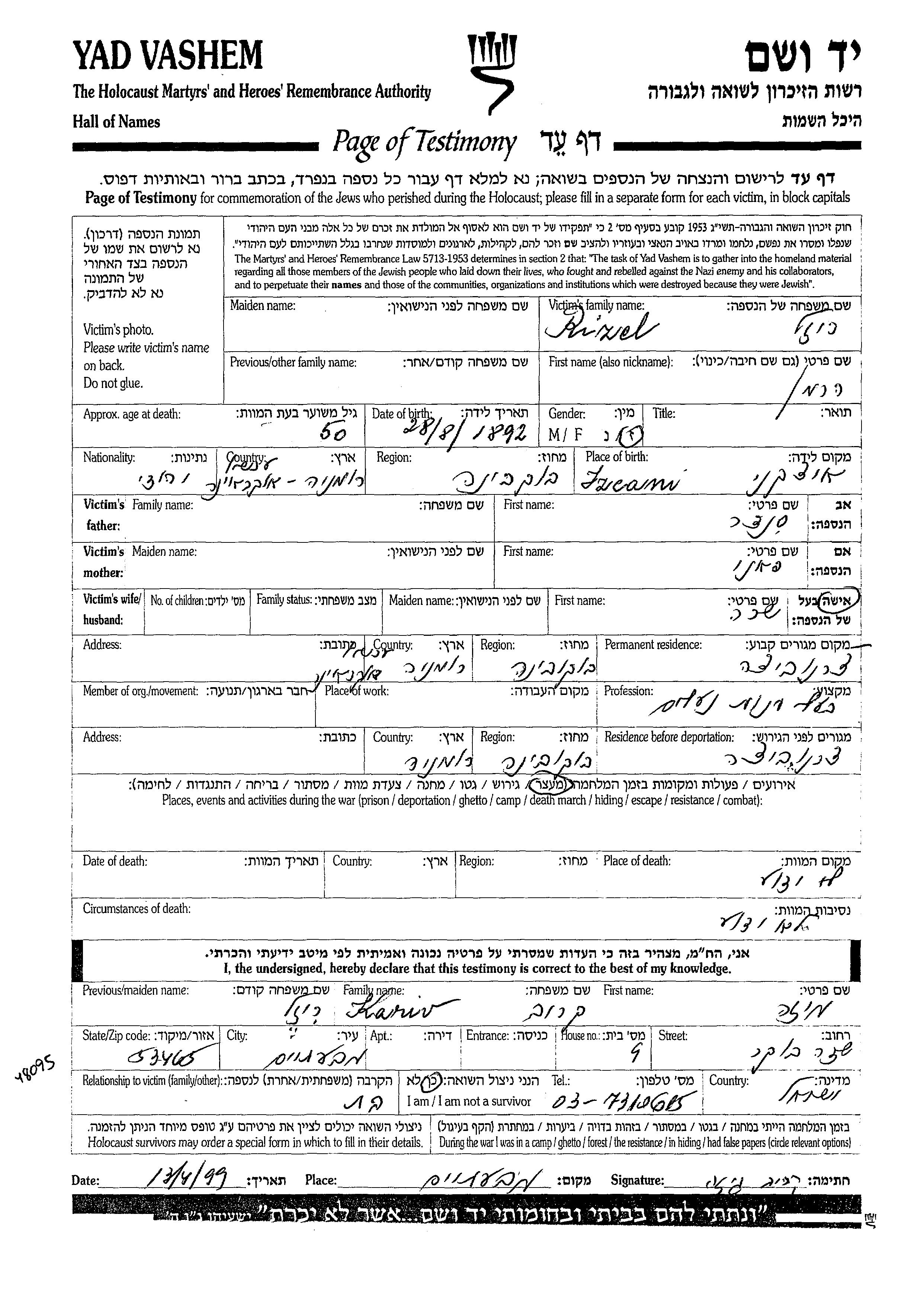 Herman Rizel wurde im Jahr 1892 in Izcani, Rumänien geboren. Er war der Sohn von Sender und Fani. Er war Besitzer eines schuhgeschäfts und mit Sara Verheiratet. Vor dem Zweiten Weltkrieg lebte er in Czernowitz, Rumänien. Während des Krieges war er in Czernowitz, Rumänien.
