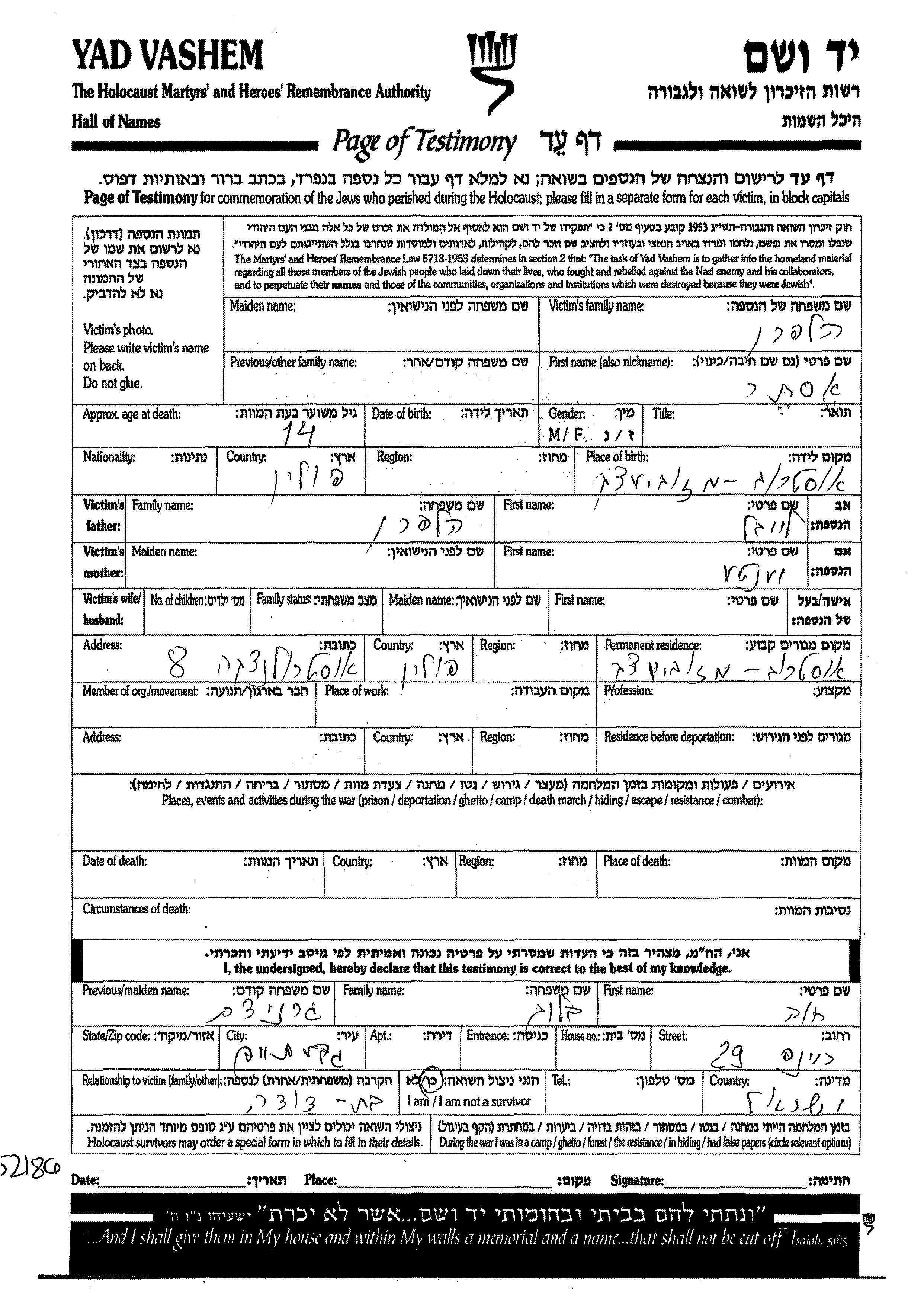Halpern Ester Ostrov Mazovyetska, Polen Gedenkblatt