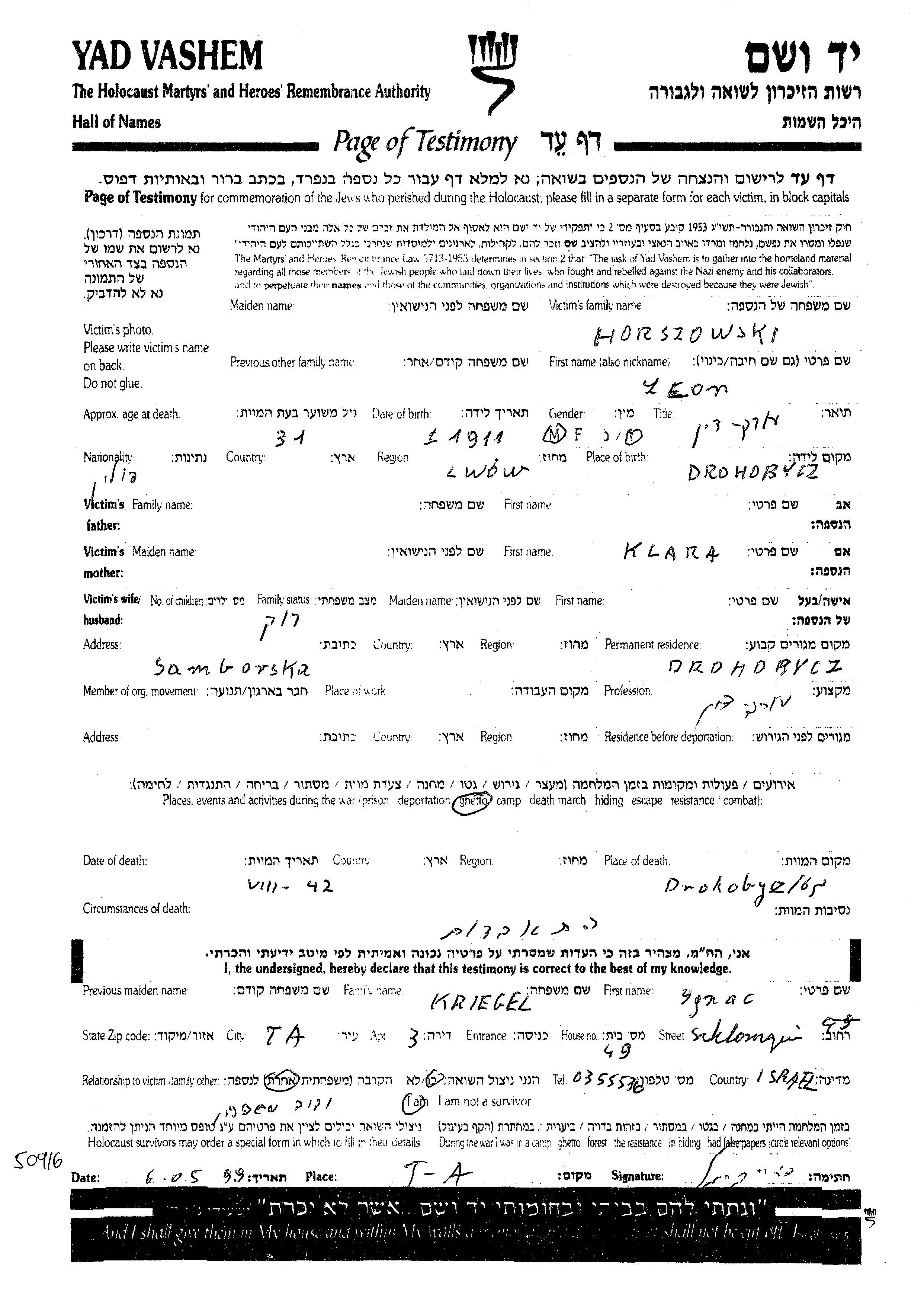 Leon Horszowski wurde im Jahr 1911 in Drohobycz, Polen geboren. Er war der Sohn von Klara. Er war Rechtsanwalt/rechtsanwältin und Ledig. Vor dem Zweiten Weltkrieg lebte er in Drohobycz, Polen.