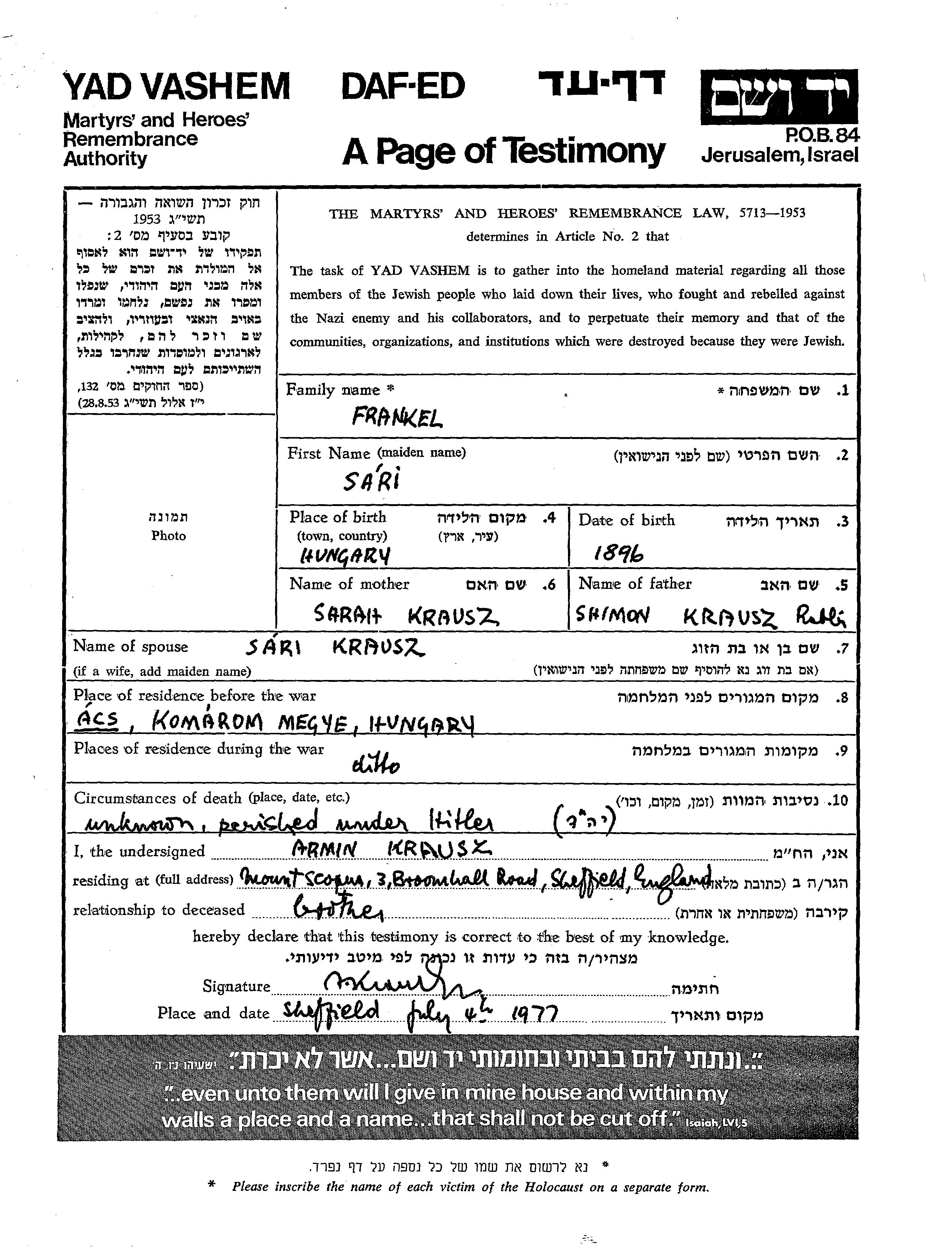 Sari Frenkel, geb. Krausz wurde im Jahr 1896 in Ungarn geboren. Sie war die Tochter von Shimon und Sarah. Sie war Verheiratet. Vor dem Zweiten Weltkrieg lebte sie in Acs, Ungarn. Während des Krieges war sie in Acs, Ungarn.