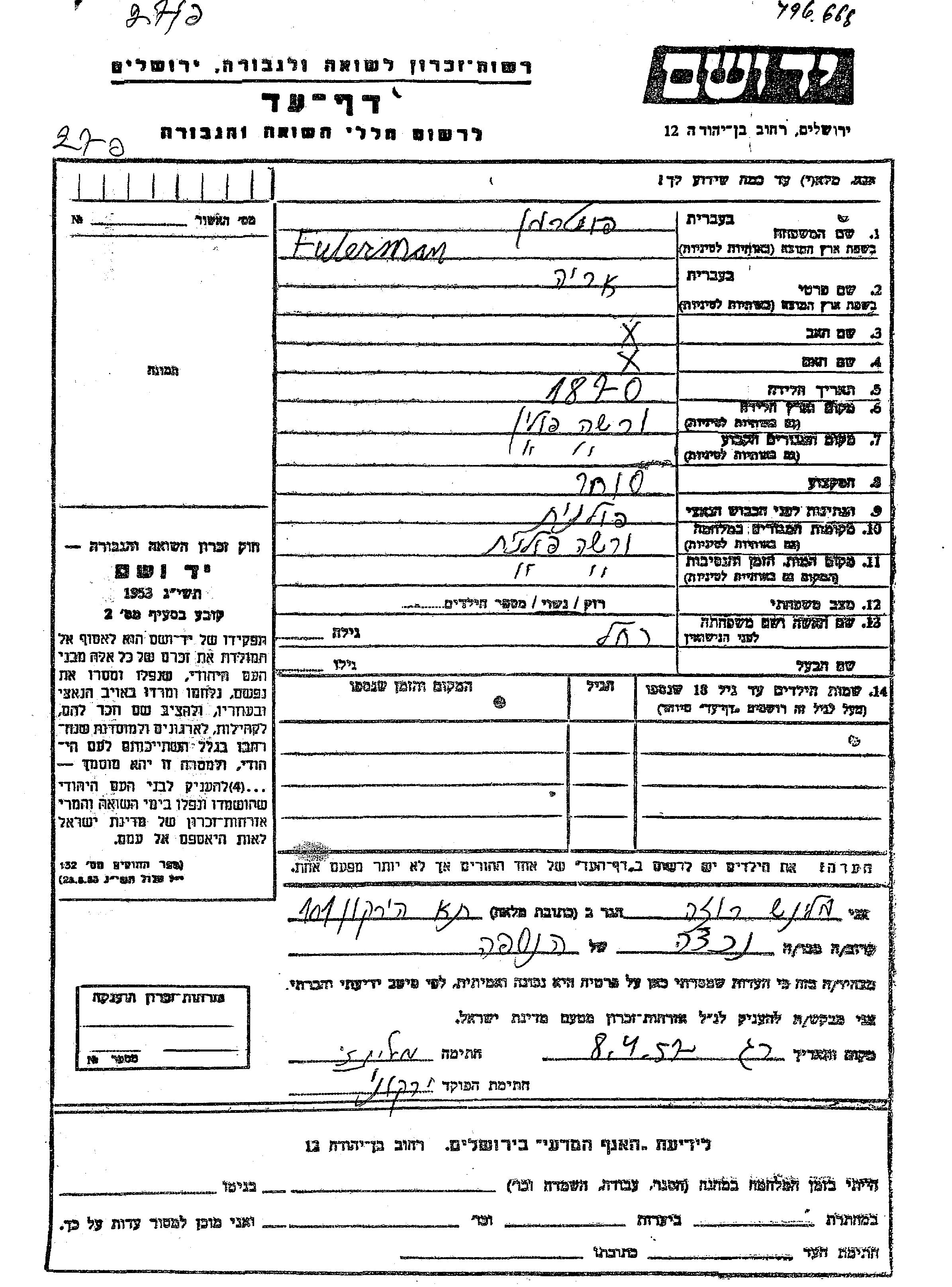 Arie Futerman wurde im Jahr 1870 in Warszawa, Polen geboren. Er war Kaufmann/-frau und mit Rakhel Verheiratet. Vor dem Zweiten Weltkrieg lebte er in Warszawa, Polen. Während des Krieges war er in Warszawa, Polen.