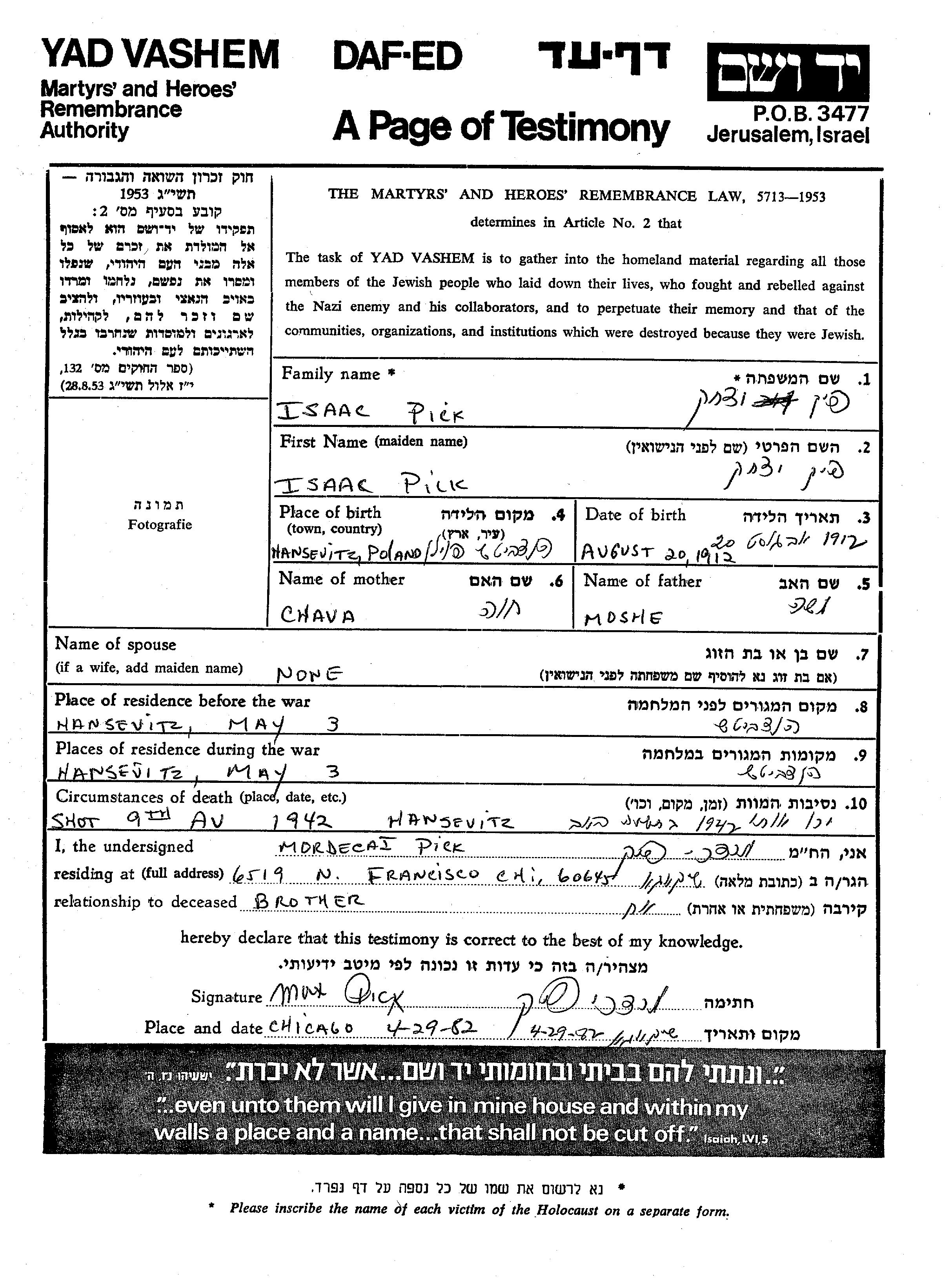 Isaac Pick wurde im Jahr 1912 in Hancewicze, Polen geboren. Er war der Sohn von Moshe und Chava. Er war Ledig. Vor dem Zweiten Weltkrieg lebte er in Hancewicze, Polen. Während des Krieges war er in Hancewicze, Polen.