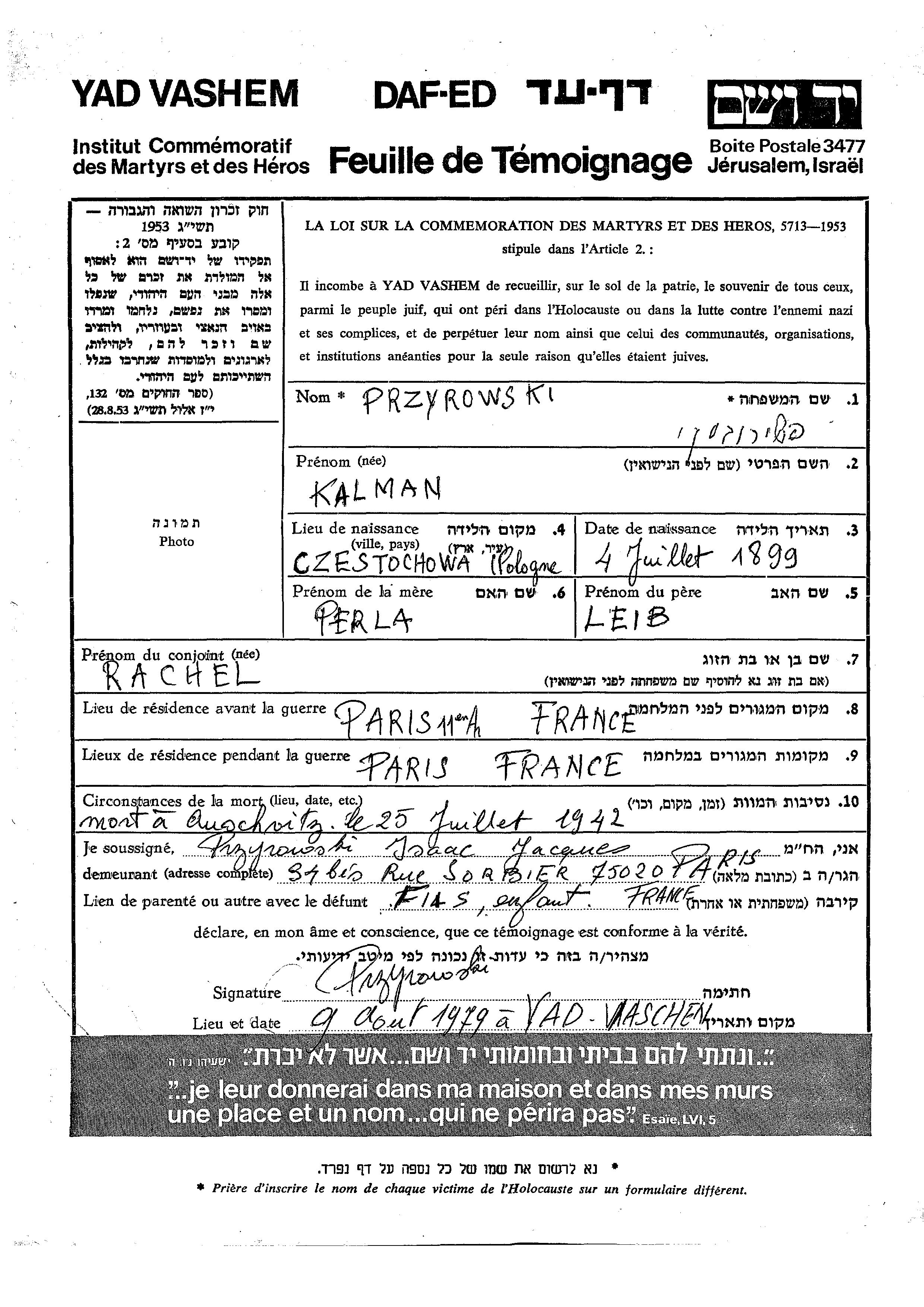 Przyrowski Kalman 1899 Czestochowa, Polen Liste von Deportierten aus Frankreich