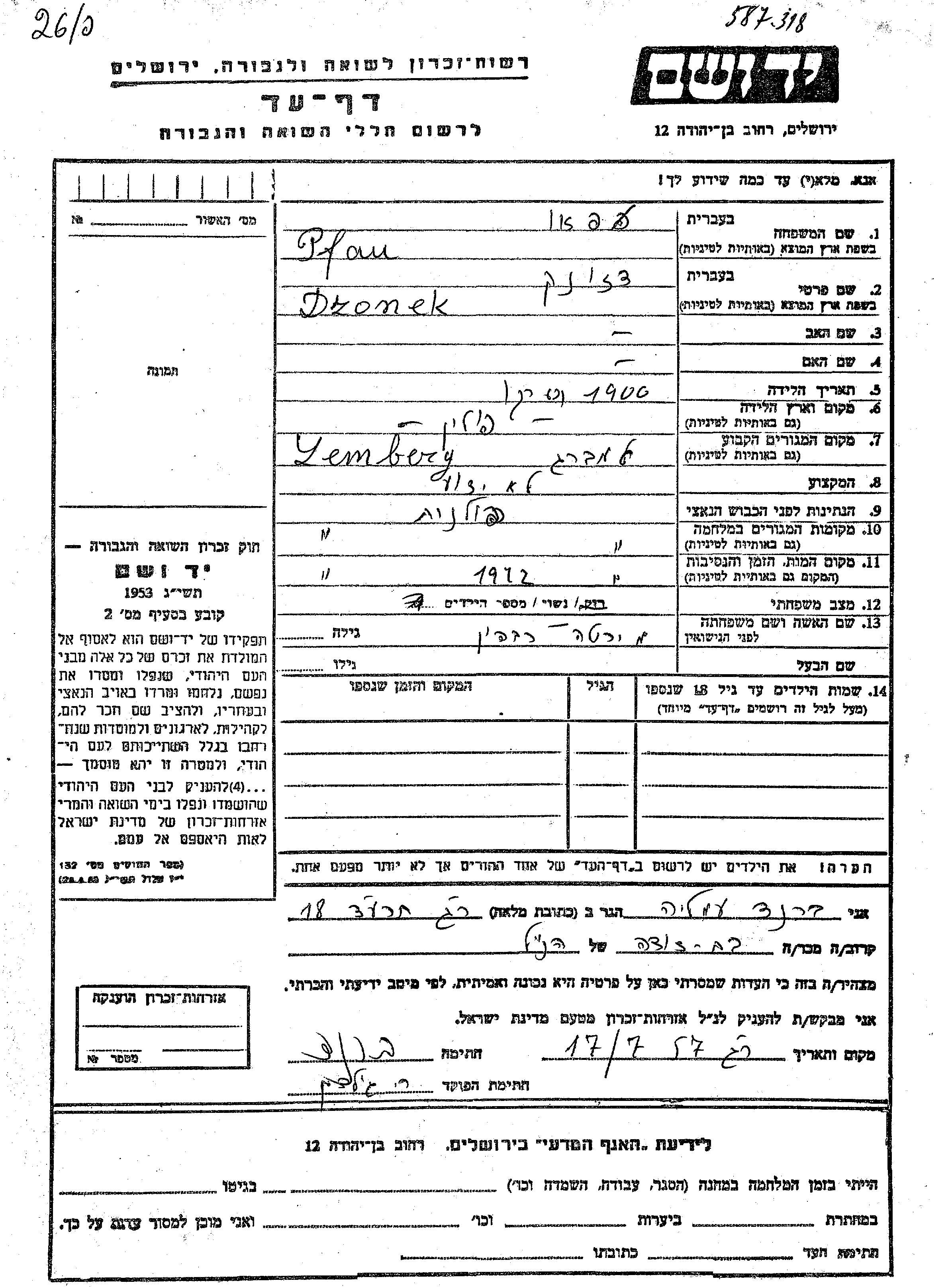 Dzonek Dzhunio Pfau Pau wurde im Jahr 1900 in Polen geboren. Er war mit Mirta, geb. Rebheim Verheiratet. Vor dem Zweiten Weltkrieg lebte er in Lemberg, Polen. Während des Krieges war er in Lemberg, Polen.