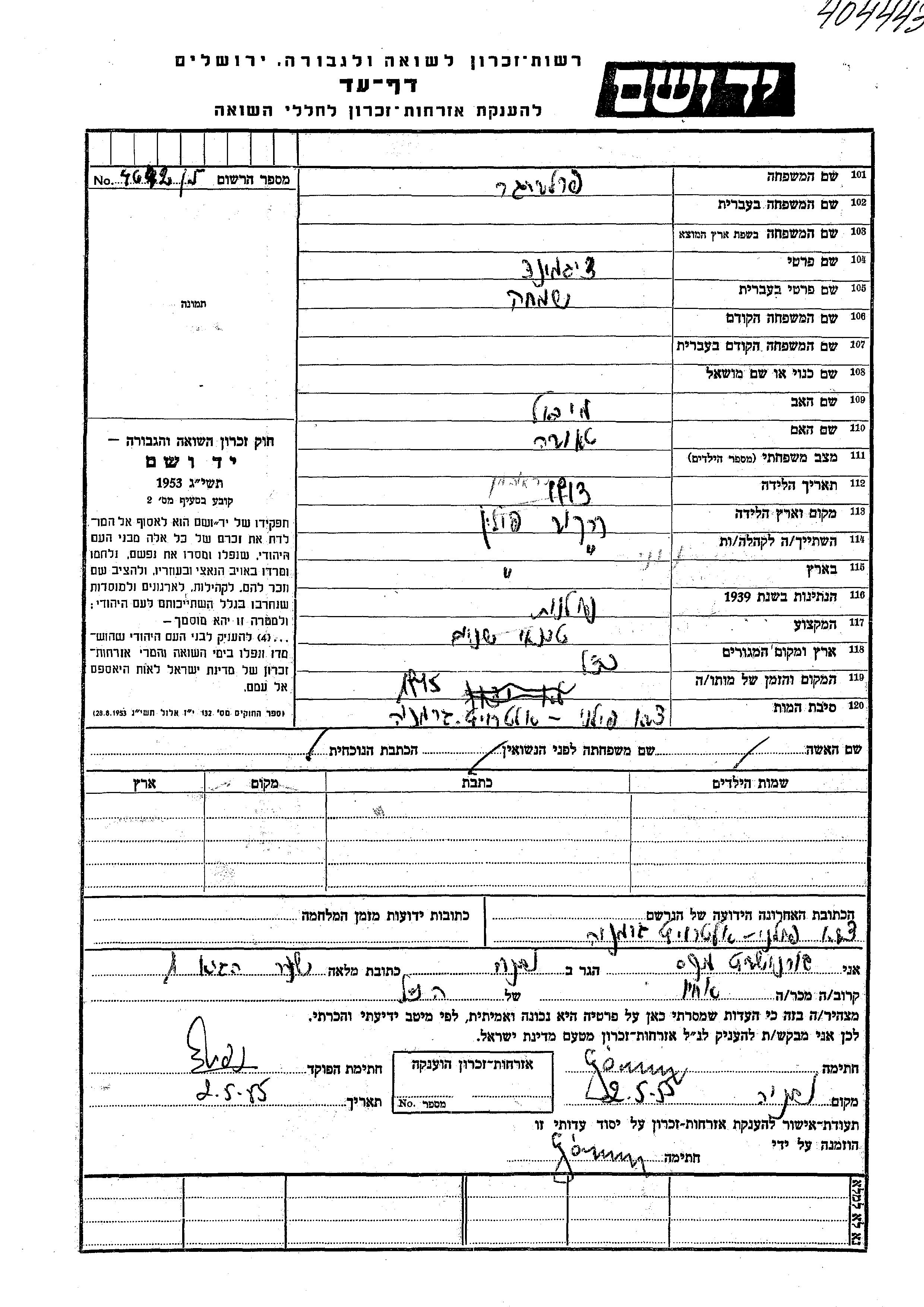 Zigmund Simkha Perlberger wurde im Jahr 1913 in Krakow, Polen geboren. Er war der Sohn von Mikhael und Tauba. Er war Zahntechniker/-in. Vor dem Zweiten Weltkrieg lebte er in Krakow, Polen. Während des Krieges war er in Deutsches Reich.