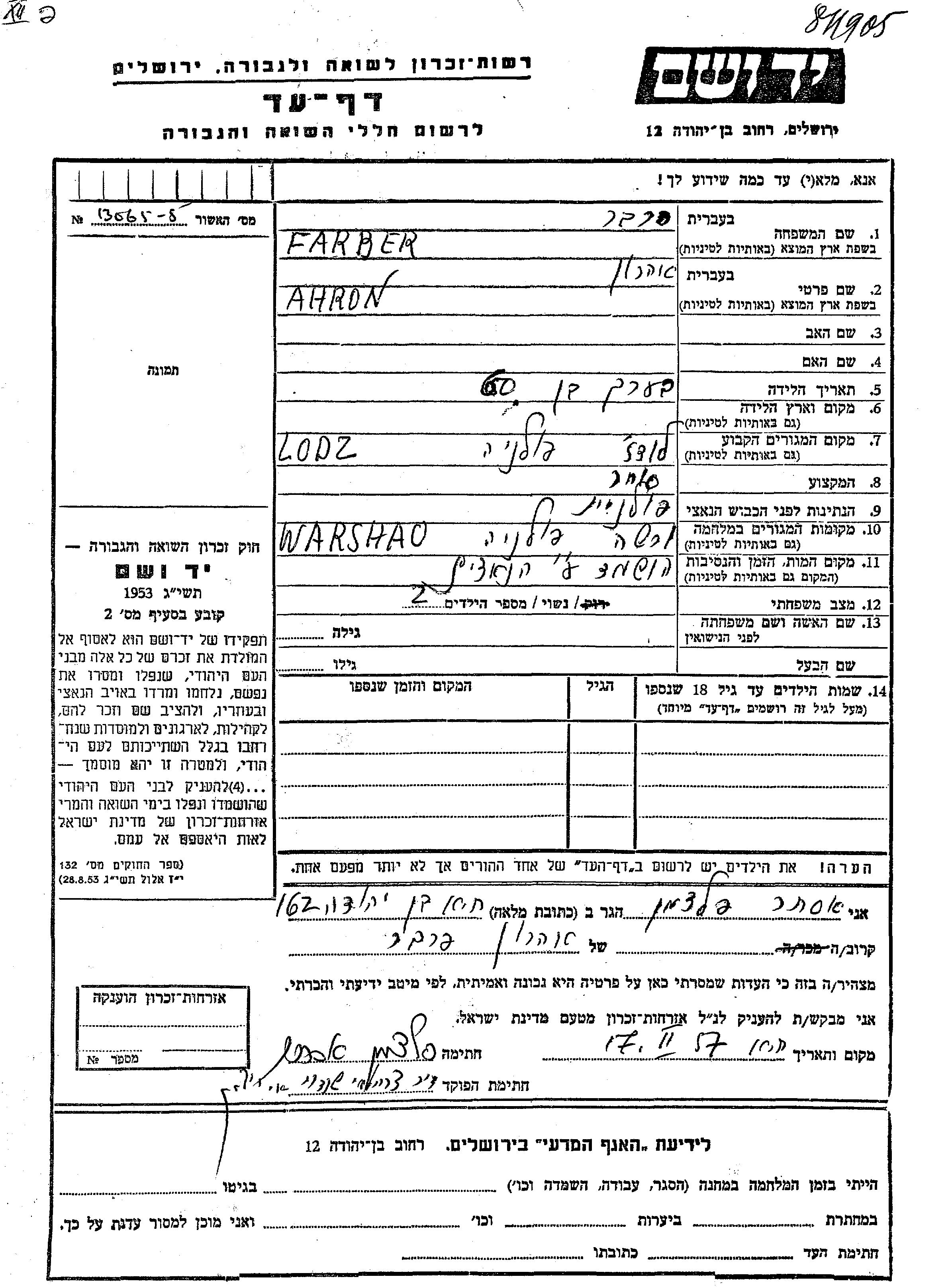 Ahron Farber. Er war Kaufmann/-frau und Verheiratet. Vor dem Zweiten Weltkrieg lebte er in Lodz, Polen. Während des Krieges war er in Warszawa, Polen.