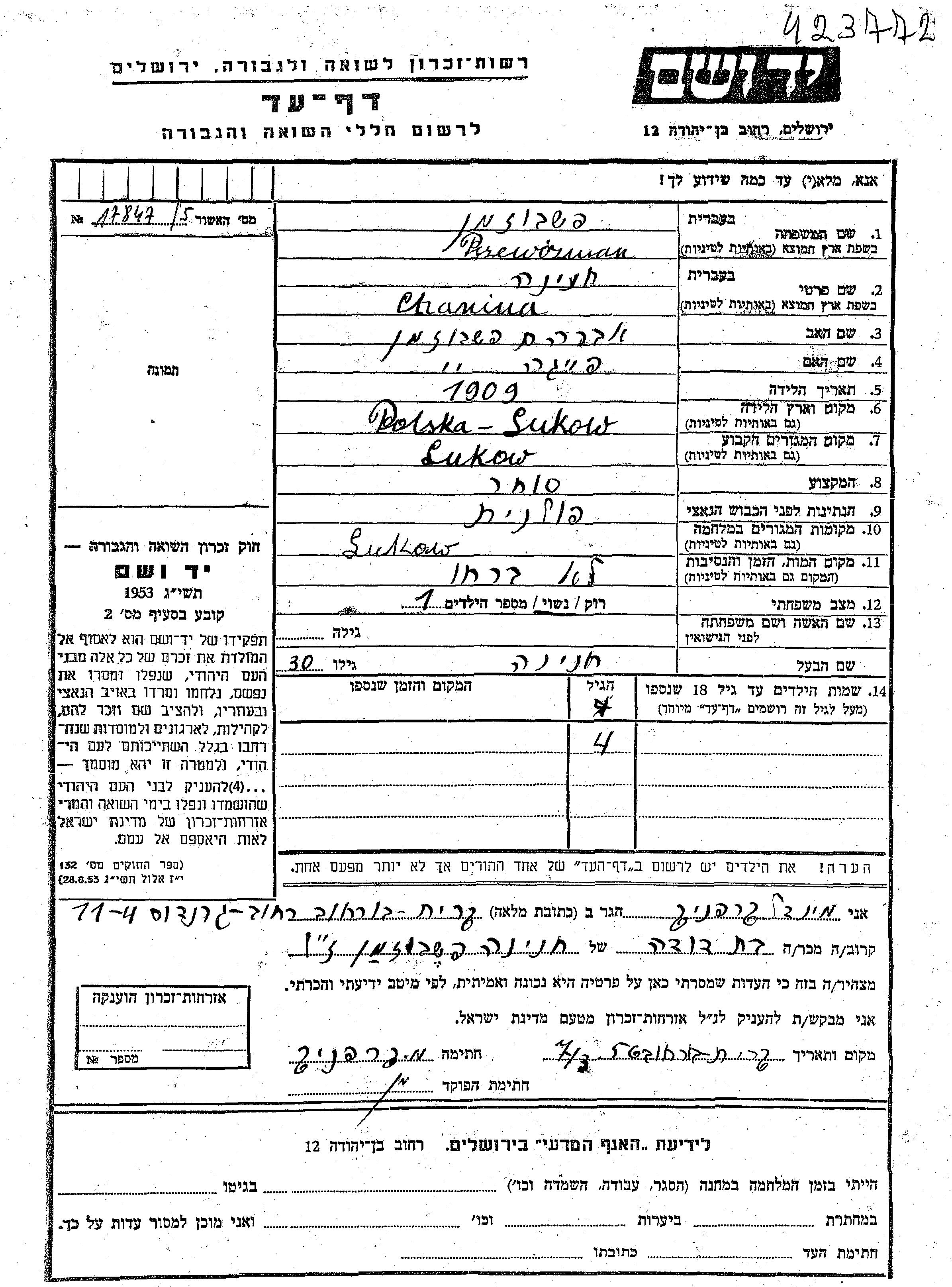 Chanina Pszewózman wurde im Jahr 1909 in Lukow, Polen geboren. Er war der Sohn von Avraham und Feiga. Er war Kaufmann/-frau und Verheiratet. Vor dem Zweiten Weltkrieg lebte er in Lukow, Polen. Während des Krieges war er in Lukow, Polen.