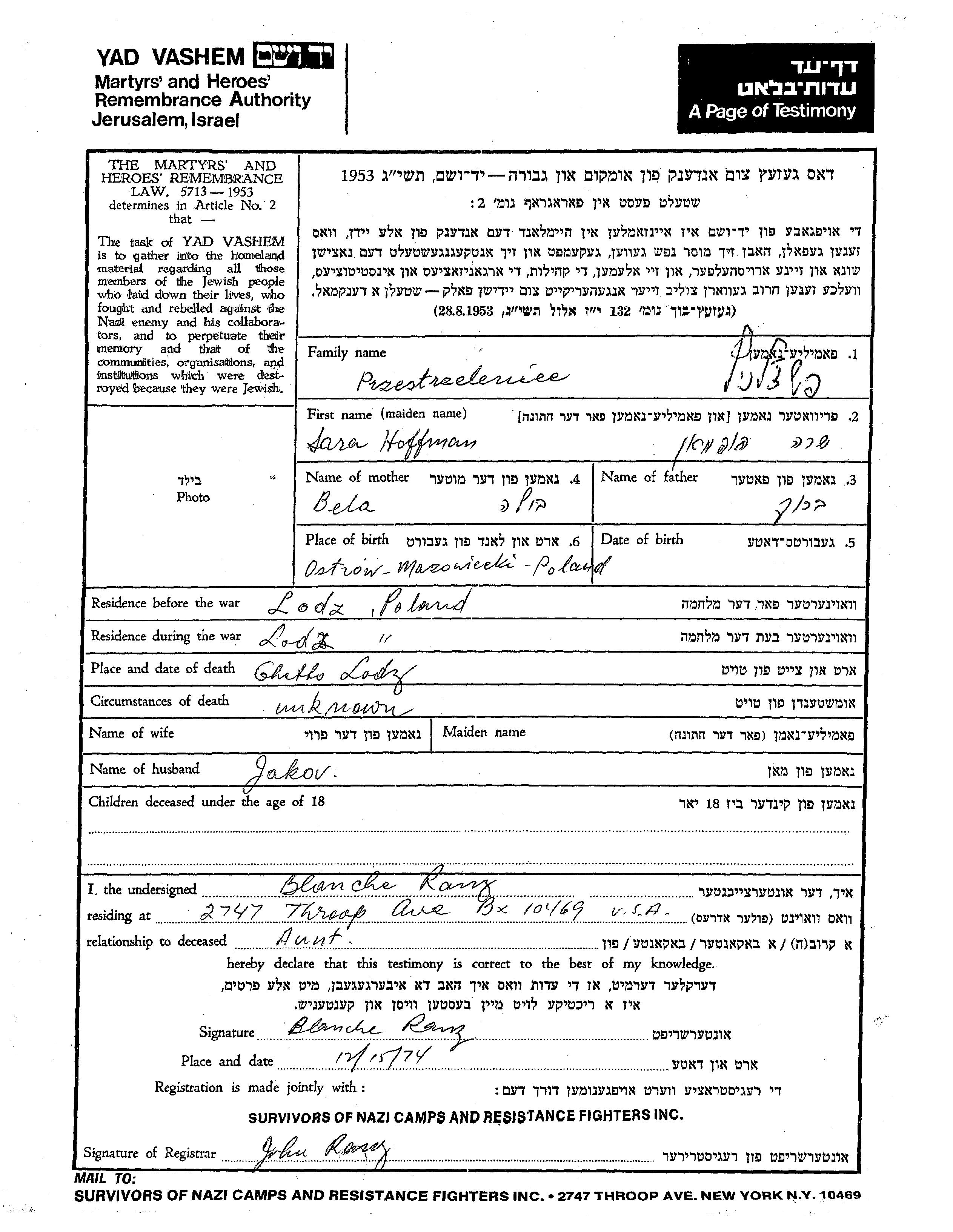 Sara Przestrzeleniec, geb. Hoffman wurde in Ostrow, Polen geboren. Sie war die Tochter von Barukh und Bila. Sie war mit Jakov Verheiratet. Vor dem Zweiten Weltkrieg lebte sie in Lodz, Polen. Während des Krieges war sie in Lodz, Polen.