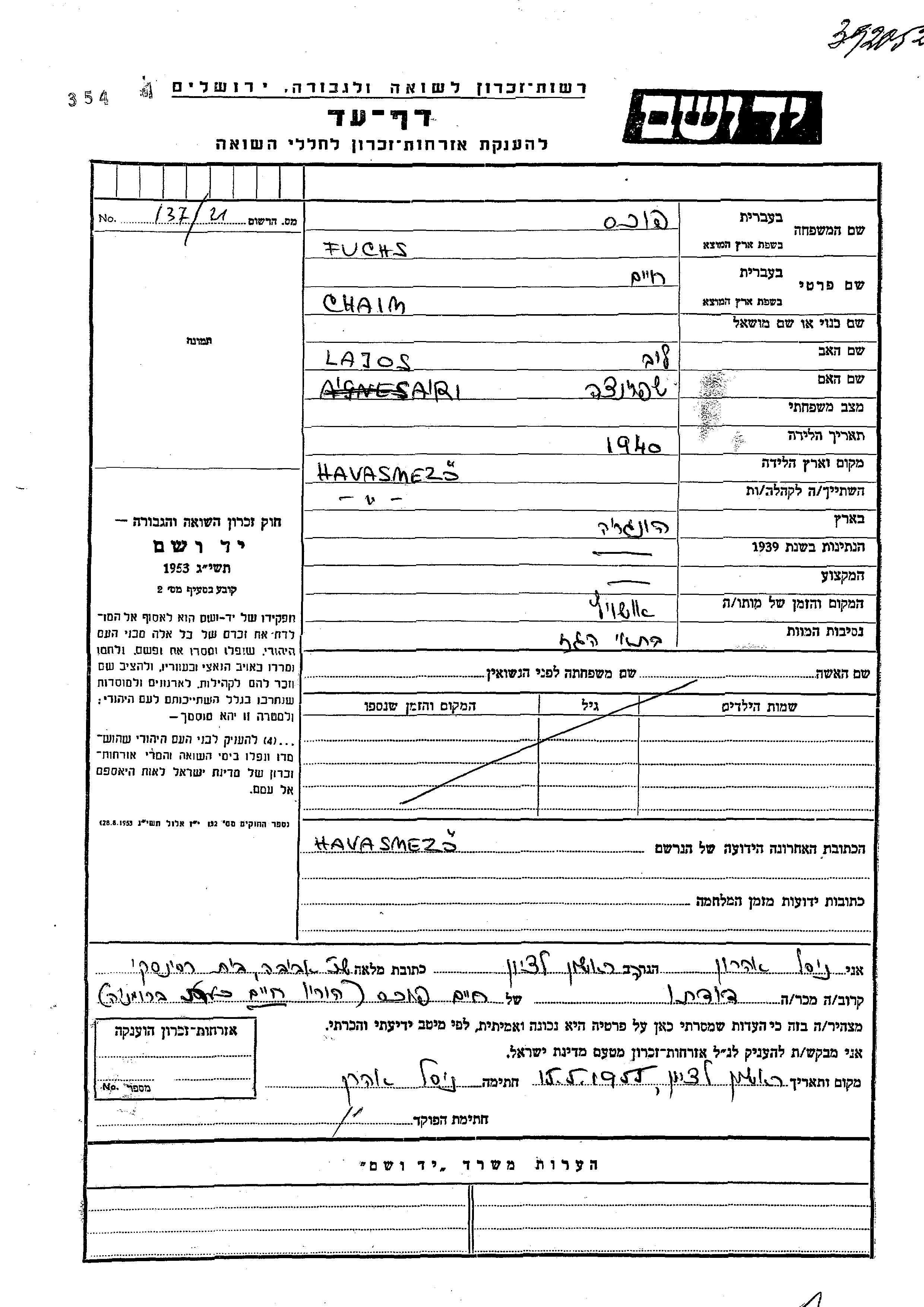 Fuchs Chaim 1940 Havasmezo, Rumänien Gedenkblatt