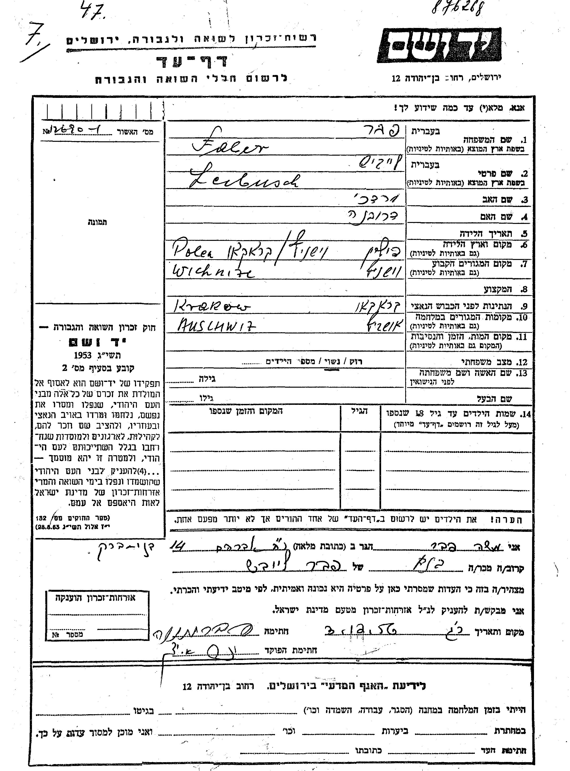 Leibusch Faber wurde in Wisnicz, Polen geboren. Er war der Sohn von Mordekhai und Drobna. Er war Verheiratet. Vor dem Zweiten Weltkrieg lebte er in Wisnicz, Polen. Während des Krieges war er in Krakow, Polen.