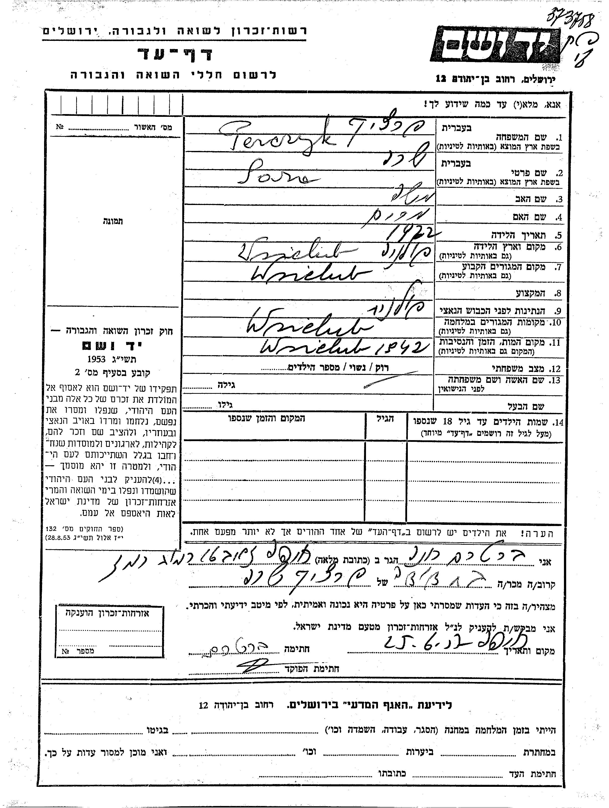Sora Perczyk wurde im Jahr 1922 in Wsielub, Polen geboren. Sie war die Tochter von Moshe und Miriam. Sie war Ledig. Vor dem Zweiten Weltkrieg lebte sie in Wsielub, Polen. Während des Krieges war sie in Wsielub, Polen.