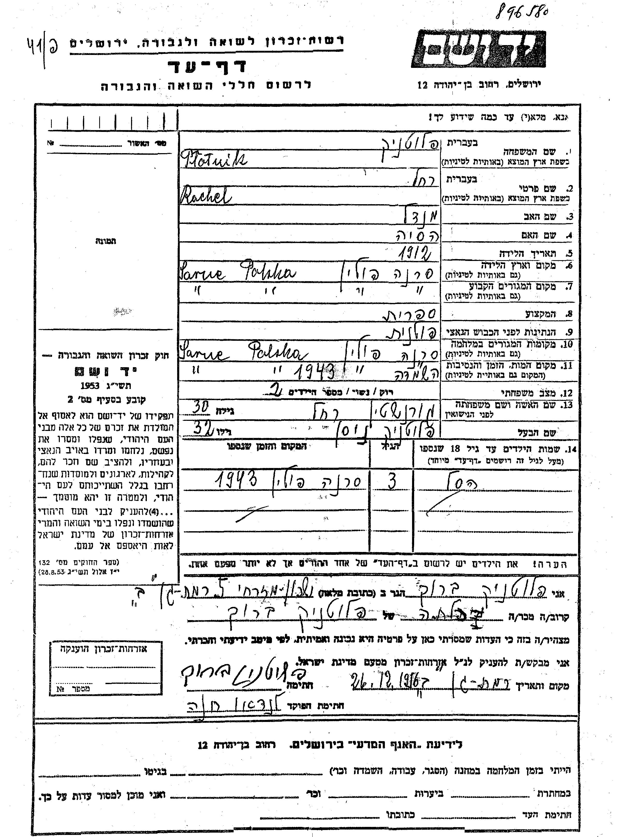 Rachel Plotnik, geb. Hornshtein wurde im Jahr 1921 in Sarny, Polen geboren. Sie war die Tochter von Mendel und Khana. Sie war Friseur/-in und mit Nisan Verheiratet. Vor dem Zweiten Weltkrieg lebte sie in Sarny, Polen. Während des Krieges war sie in Sarny, Polen.