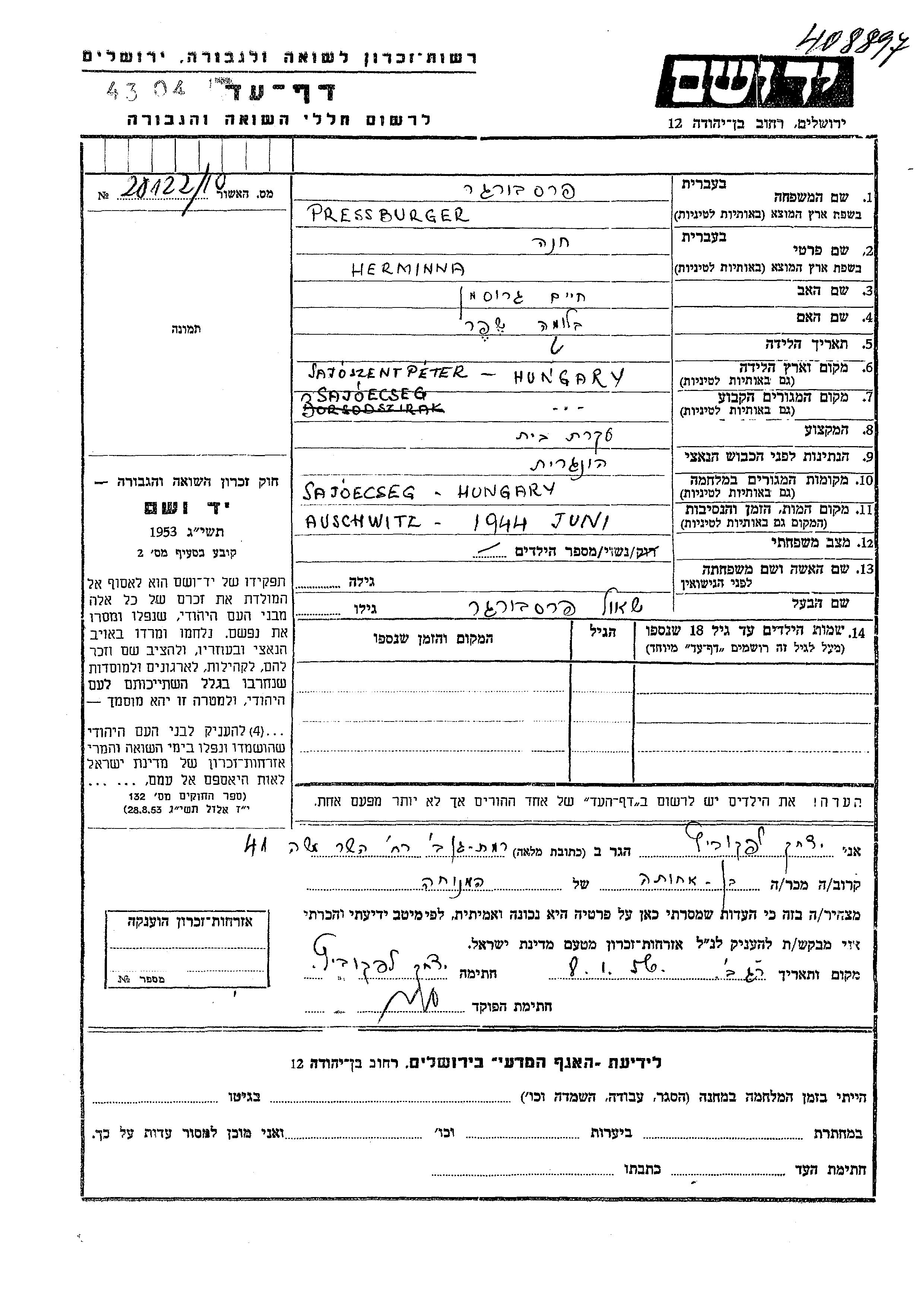 Herminna Khana Pressburger, geb. Grosman wurde in Sajoszentpeter, Ungarn geboren. Sie war die Tochter von Khaim und Bluma. Sie war Hausfrau und mit Shaul Verheiratet. Vor dem Zweiten Weltkrieg lebte sie in Sajoecseg, Ungarn. Während des Krieges war sie in Sajoecseg, Ungarn.