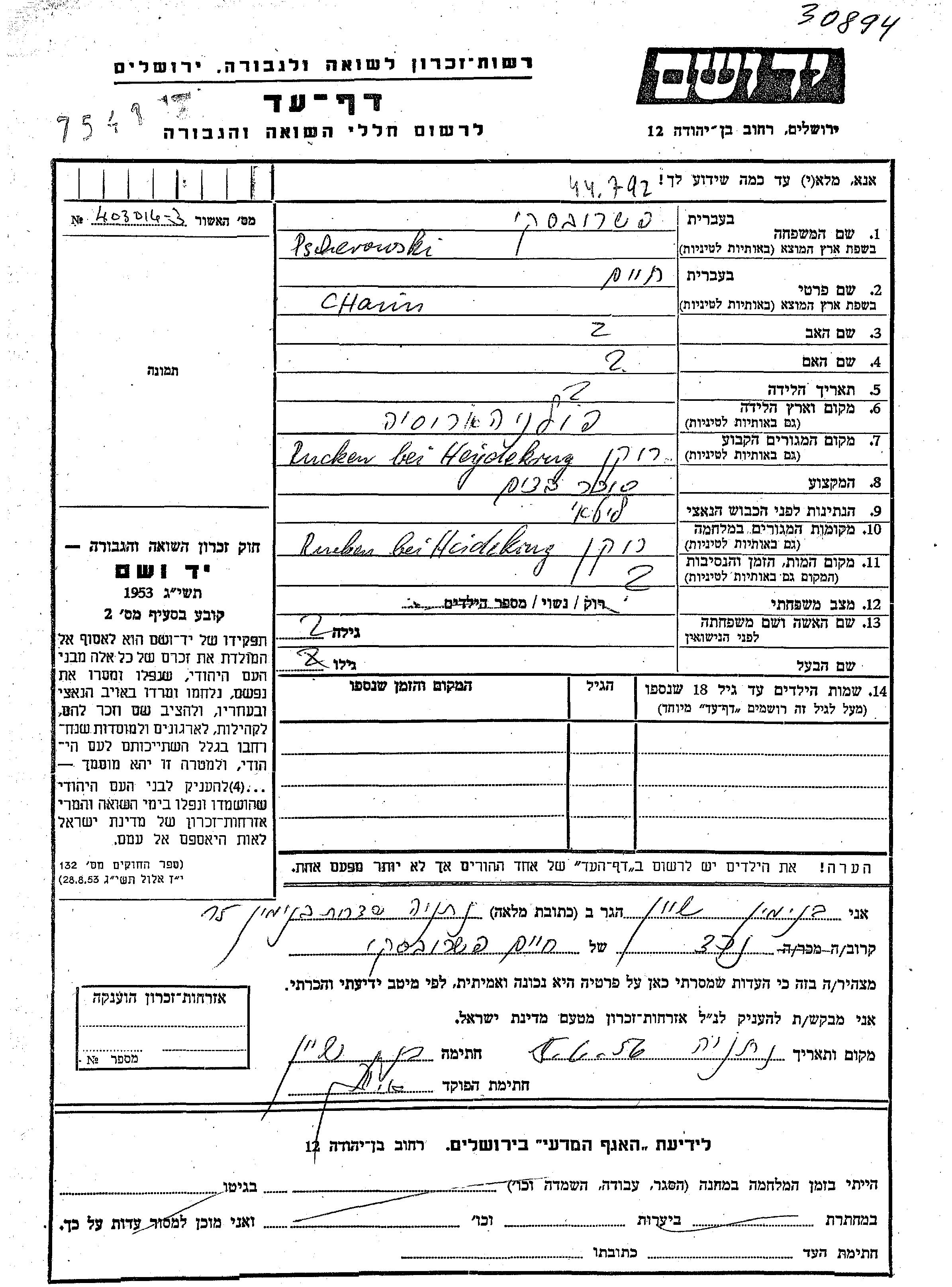 Chaim Pscherowski wurde in Polen geboren. Er war Textilhändler/-in und Verheiratet. Vor dem Zweiten Weltkrieg lebte er in Raken, Litauen. Während des Krieges war er in Raken, Litauen.