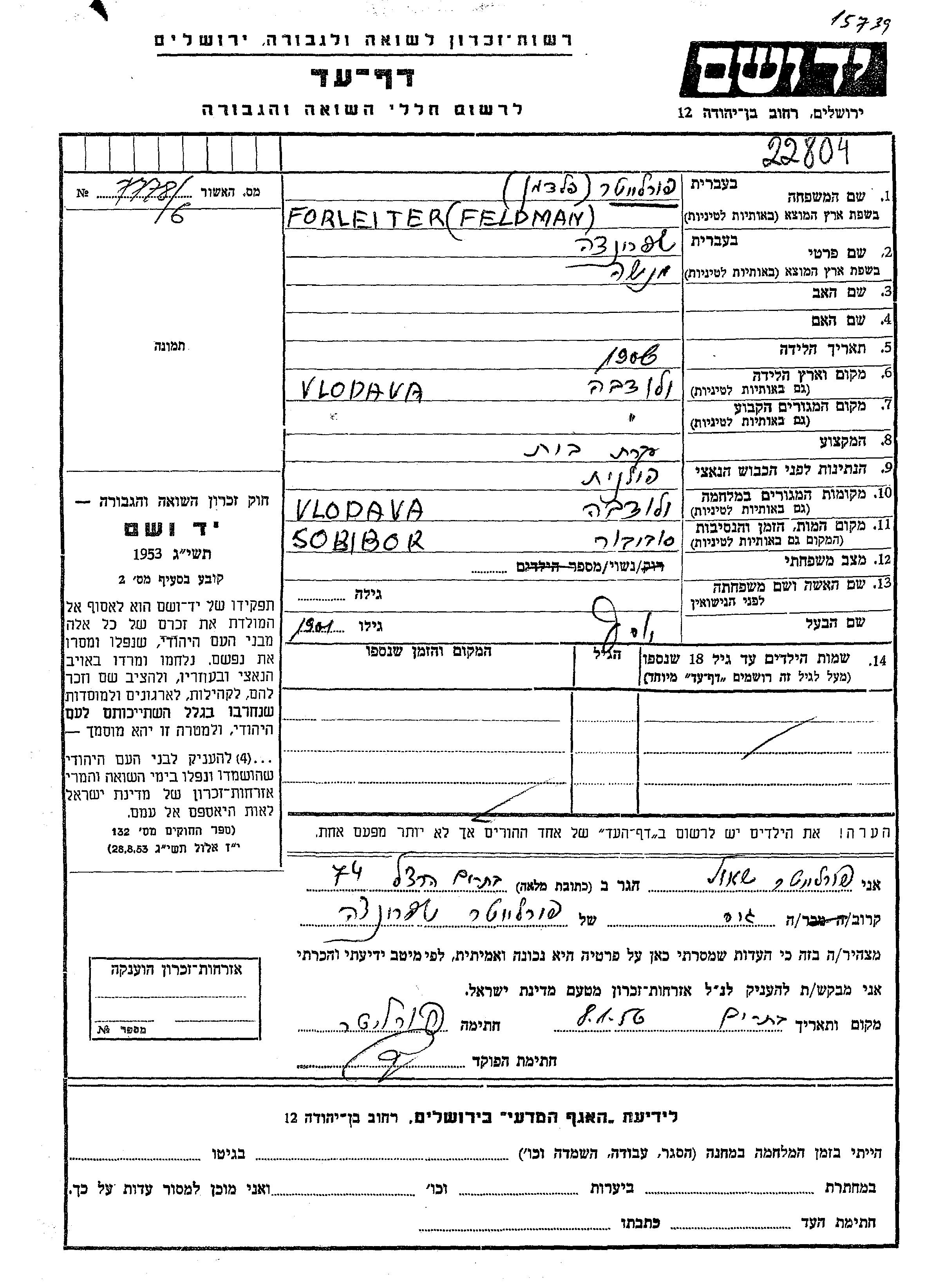 Shprintza Forleiter, geb. Feldman wurde im Jahr 1906 in Wlodawa, Polen geboren. Sie war die Tochter von Menashe. Sie war Hausfrau und mit Yosef Verheiratet. Vor dem Zweiten Weltkrieg lebte sie in Wlodawa, Polen. Während des Krieges war sie in Wlodawa, Polen.
