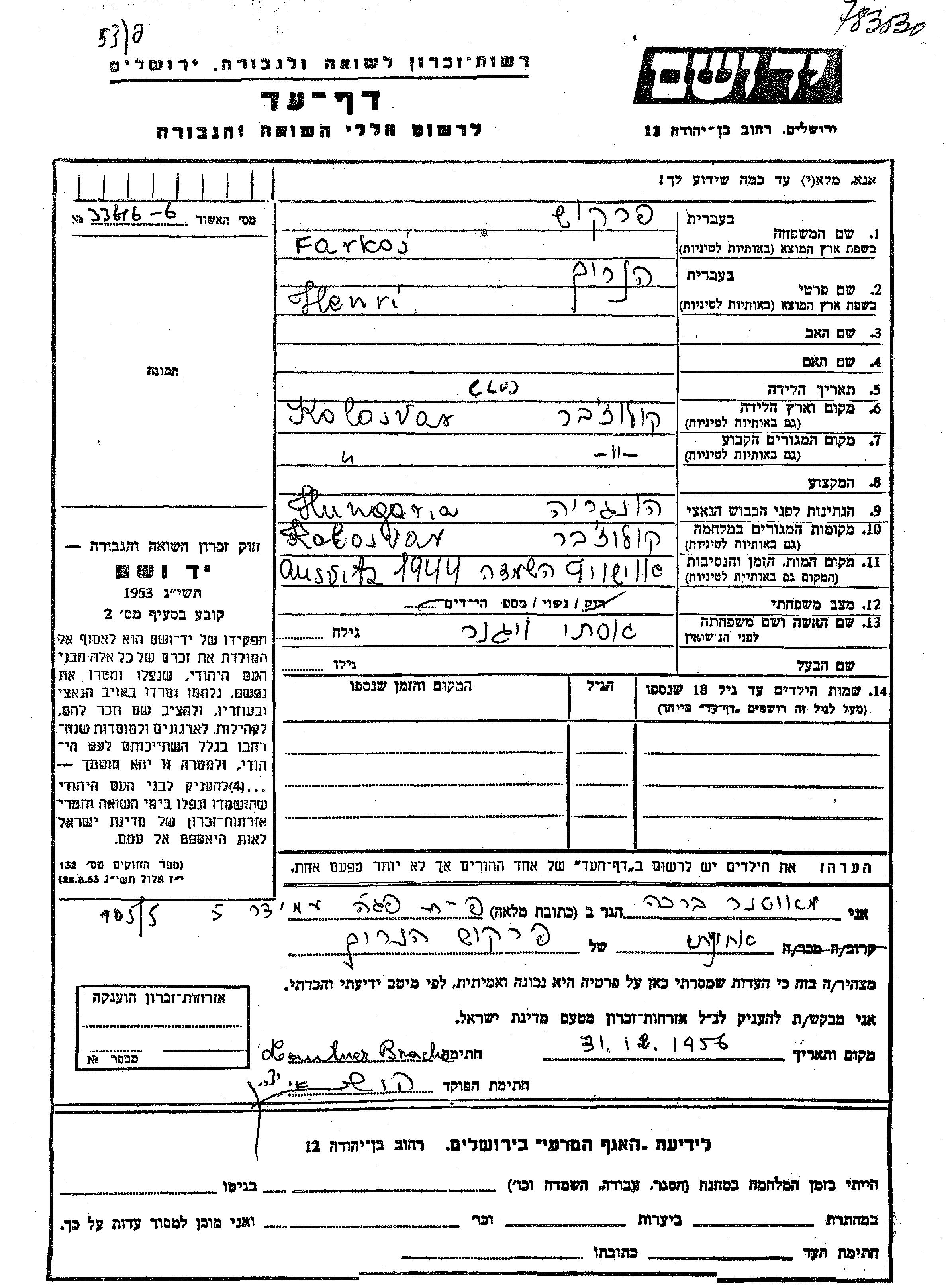 Henri Farkas Perkush wurde in Kolosvar, Rumänien geboren. Er war mit Ester, geb. Vignar Verheiratet. Vor dem Zweiten Weltkrieg lebte er in Kolosvar, Rumänien. Während des Krieges war er in Kolosvar, Rumänien.