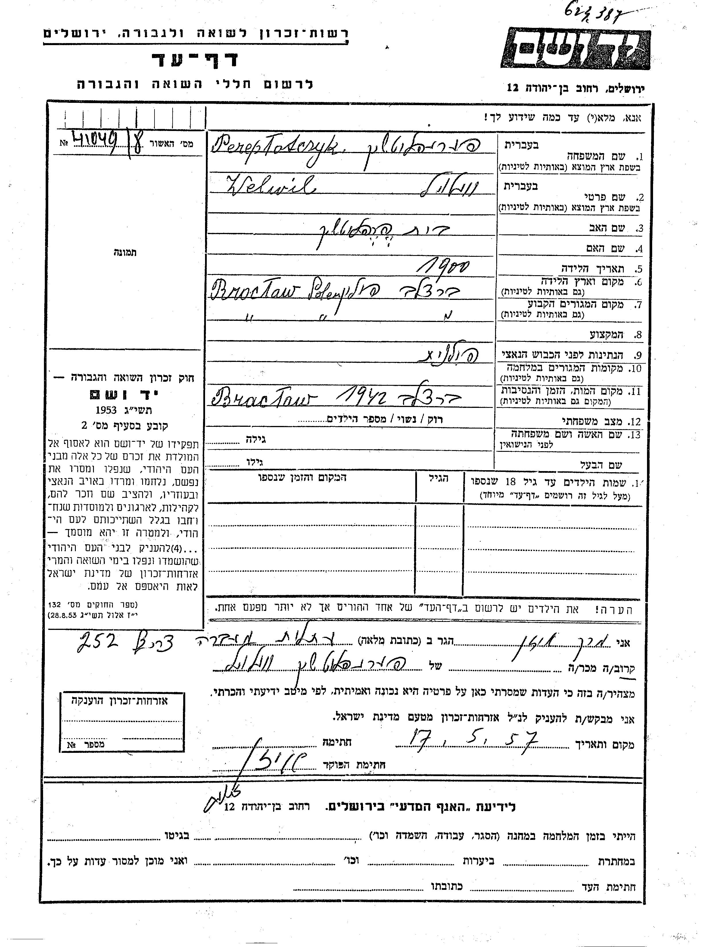 Welwil Pereplotczyk wurde im Jahr 1900 in Braclaw, Ukraine (UdSSR) geboren. Vor dem Zweiten Weltkrieg lebte er in Braclaw, Ukraine (UdSSR).