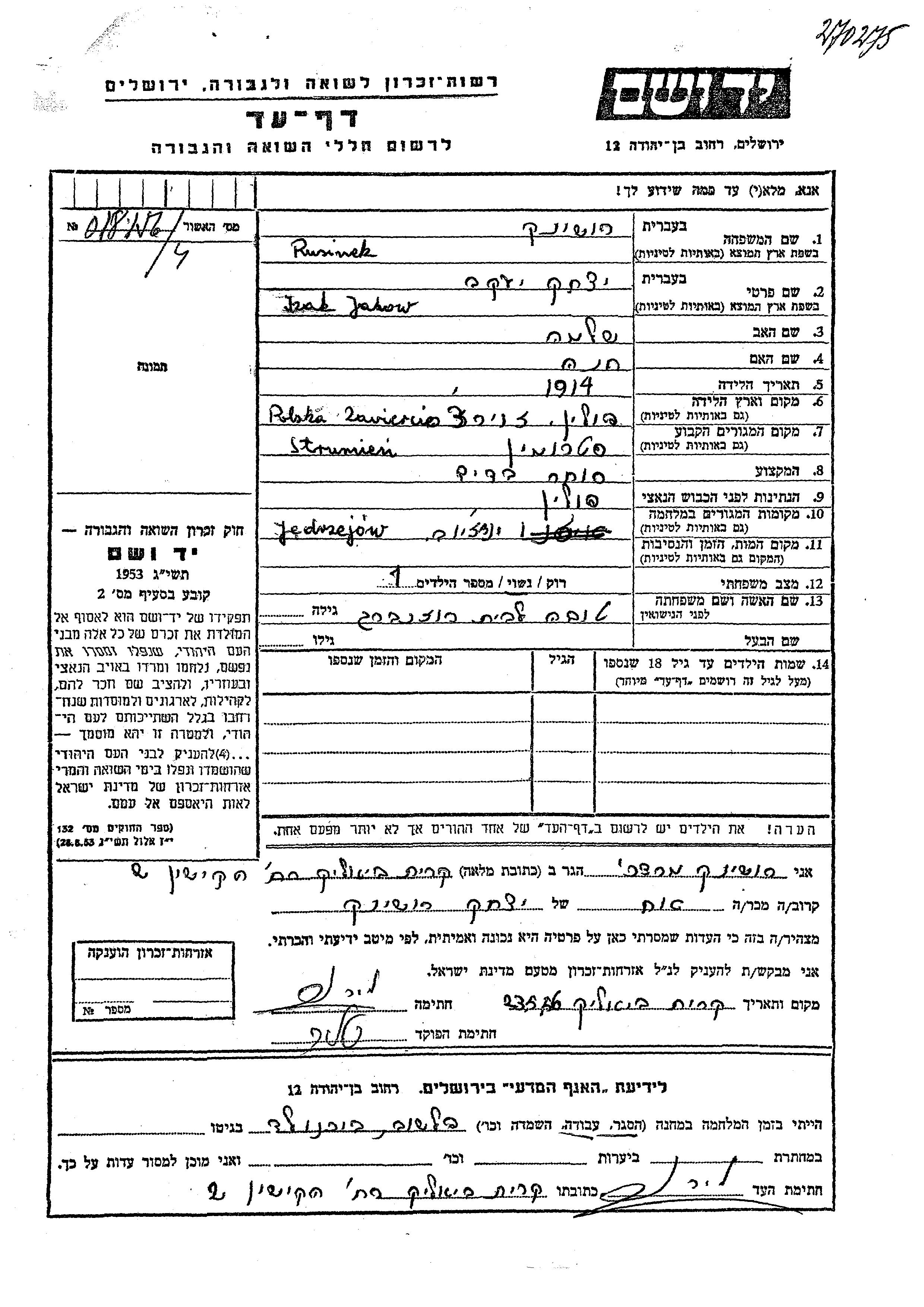 Yakow Yzak Rusinek wurde im Jahr 1914 in Zaviercie, Polen geboren. Er war der Sohn von Shlomo und Khana. Er war Textilhändler/-in und mit Tova, geb. Rozenberg Verheiratet. Vor dem Zweiten Weltkrieg lebte er in Strumien, Polen. Während des Krieges war er in Jedrzejow, Polen.
