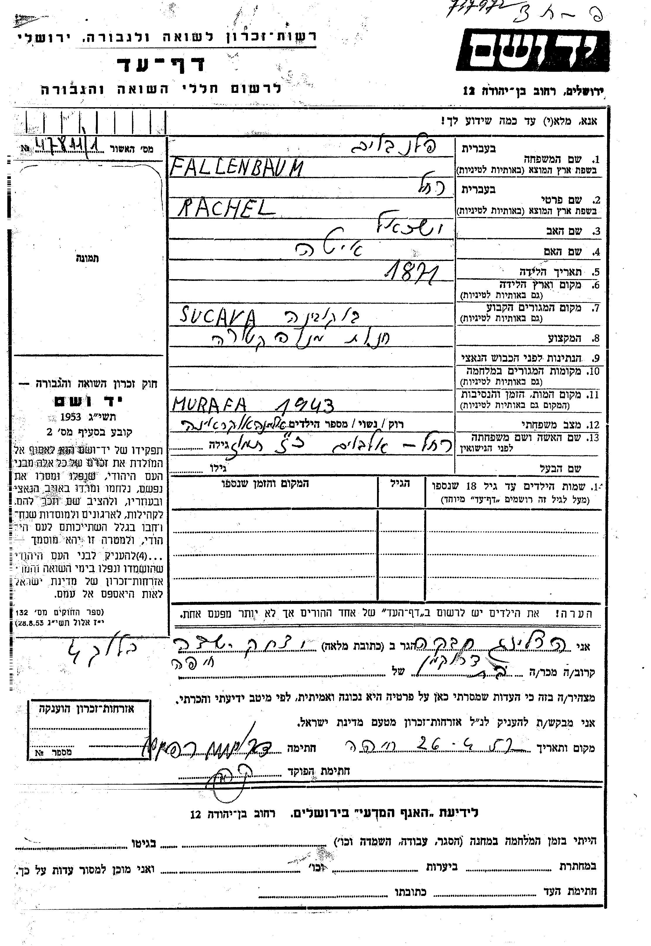 Rachel Fallenbaum, geb. Album wurde im Jahr 1871 geboren. Sie war die Tochter von Yisrael und Ita. Sie war Verheiratet. Vor dem Zweiten Weltkrieg lebte sie in Sucava, Rumänien.