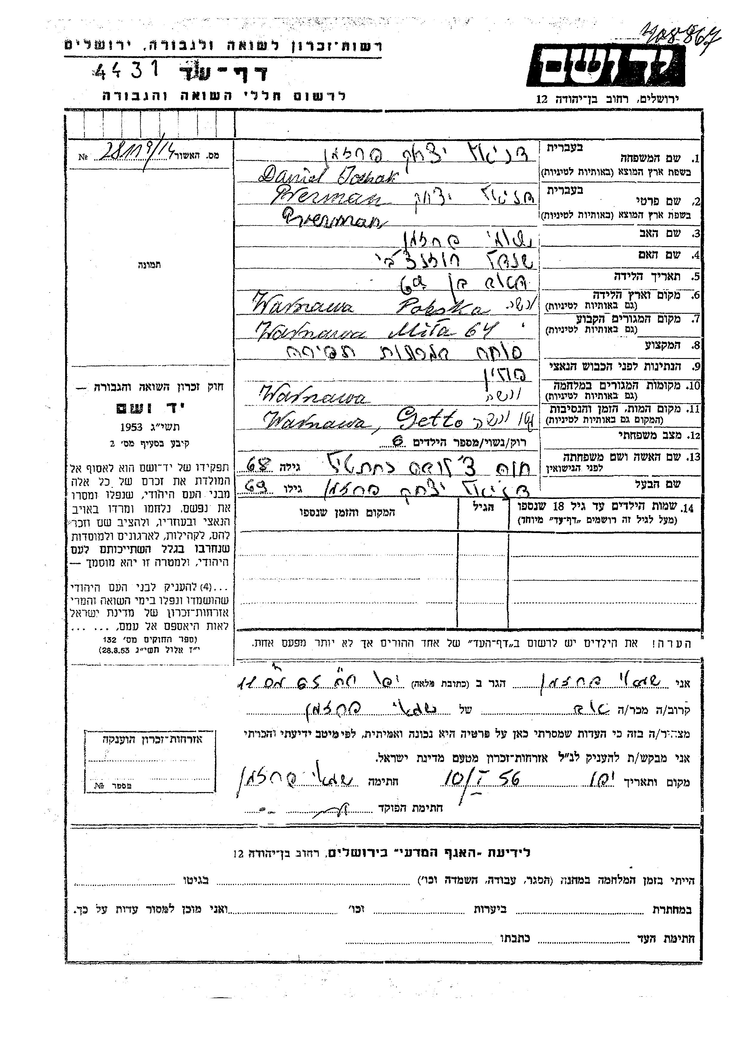 Jcchak Daniel Prezman wurde in Warszawa, Polen geboren. Er war der Sohn von Shamai und Shendel. Er war Nähmaschinenhändler und mit Khava Tzluva, geb. Nakhteil Verheiratet. Vor dem Zweiten Weltkrieg lebte er in Warszawa, Polen. Während des Krieges war er in Warszawa, Polen.