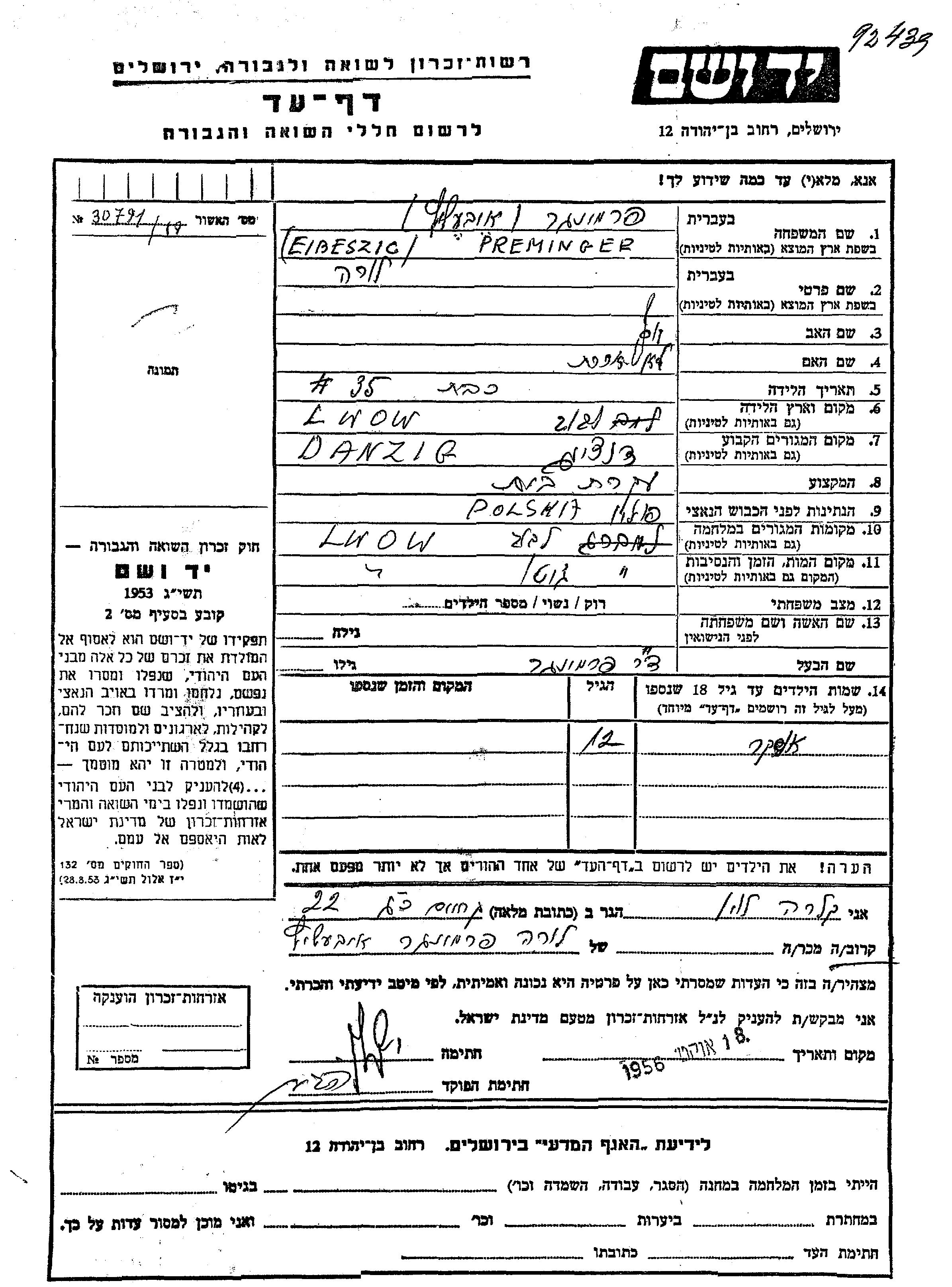 Lora Eibeszic Preminger wurde in Lwow, Polen geboren. Sie war die Tochter von Yosef. Sie war Hausfrau und Verheiratet. Vor dem Zweiten Weltkrieg lebte sie in Danzig, Freie Stadt Danzig. Während des Krieges war sie in Lwow, Polen.