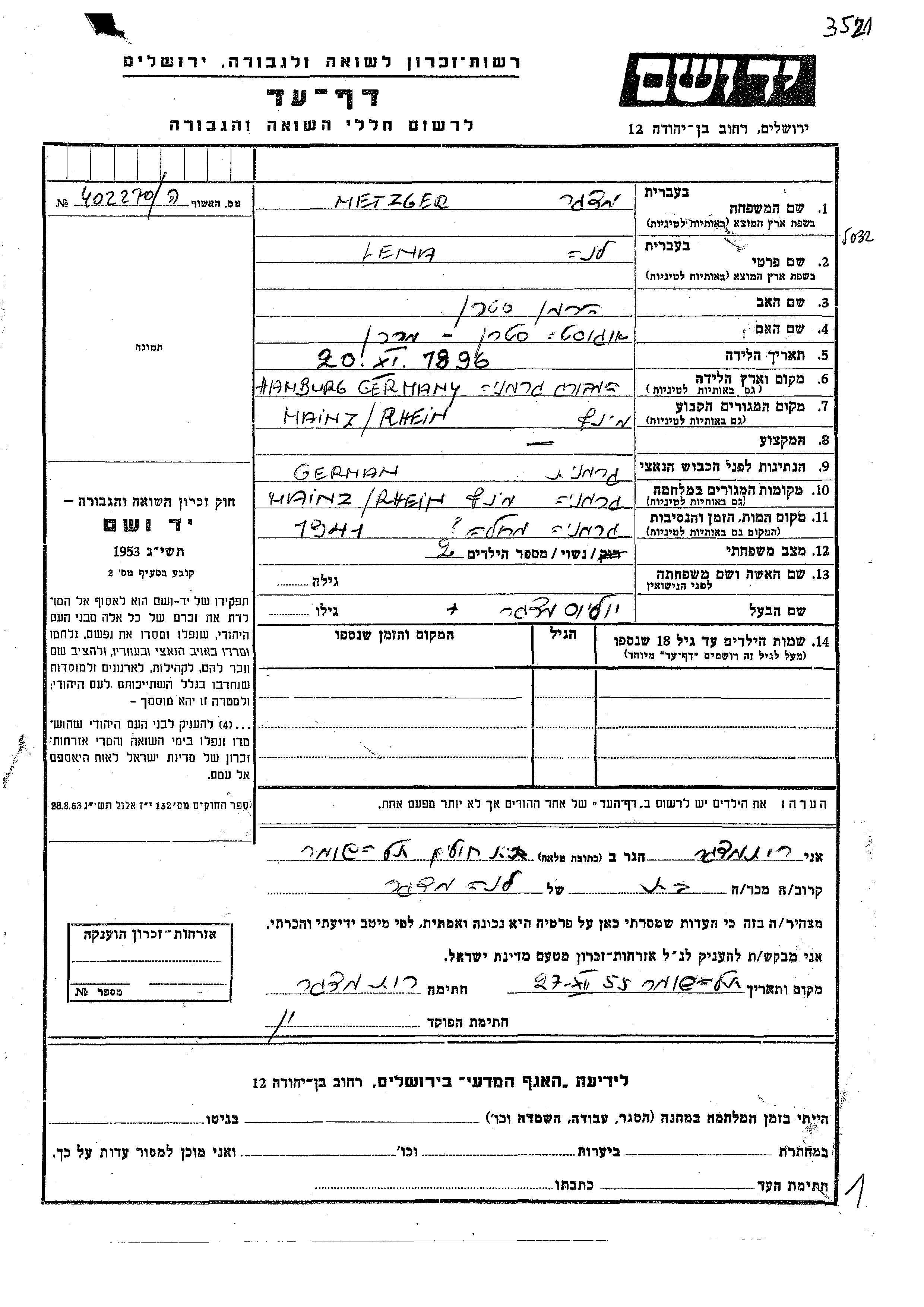 Lena Metzger, geb. Satran wurde im Jahr 1896 in Hamburg, Deutsches Reich geboren. Sie war die Tochter von Herman und Augusta. Sie war mit Yulius Verheiratet. Vor dem Zweiten Weltkrieg lebte sie in Mainz, Deutsches Reich. Während des Krieges war sie in Mainz, Deutsches Reich.