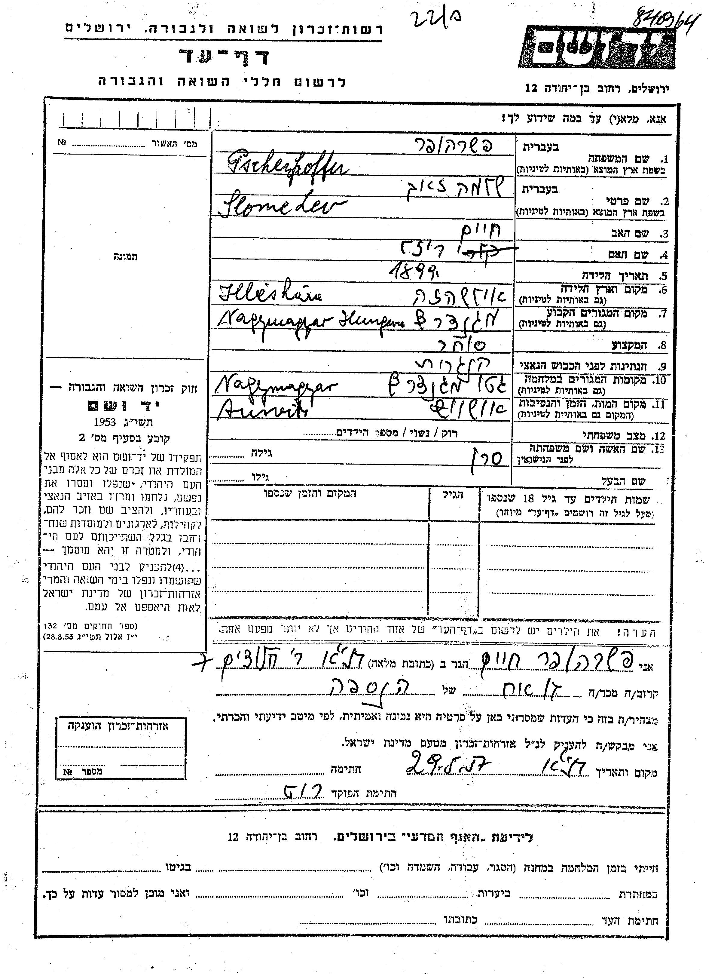 Slome Zeev Pscherhoffer wurde im Jahr 1899 in Illeshaza, Tschechoslowakei geboren. Er war der Sohn von Khaim und Reizel. Er war Kaufmann/-frau und mit Seren Verheiratet. Vor dem Zweiten Weltkrieg lebte er in Nagymagyar, Tschechoslowakei. Während des Krieges war er in Nagymagyar, Tschechoslowakei.
