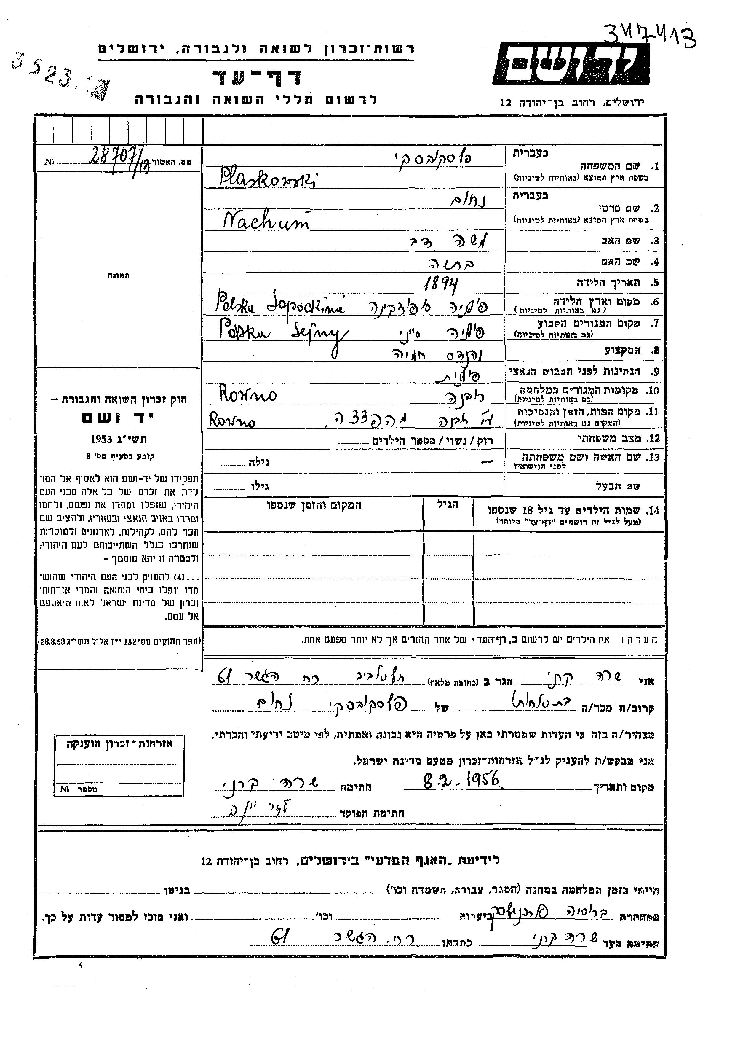 Nachum Plaskowski wurde im Jahr 1894 in Sopockine, Polen geboren. Er war der Sohn von Moshe Dov und Batia. Er war Chemieingenieur und Ledig. Vor dem Zweiten Weltkrieg lebte er in Sejny, Polen. Während des Krieges war er in Rowno, Polen.