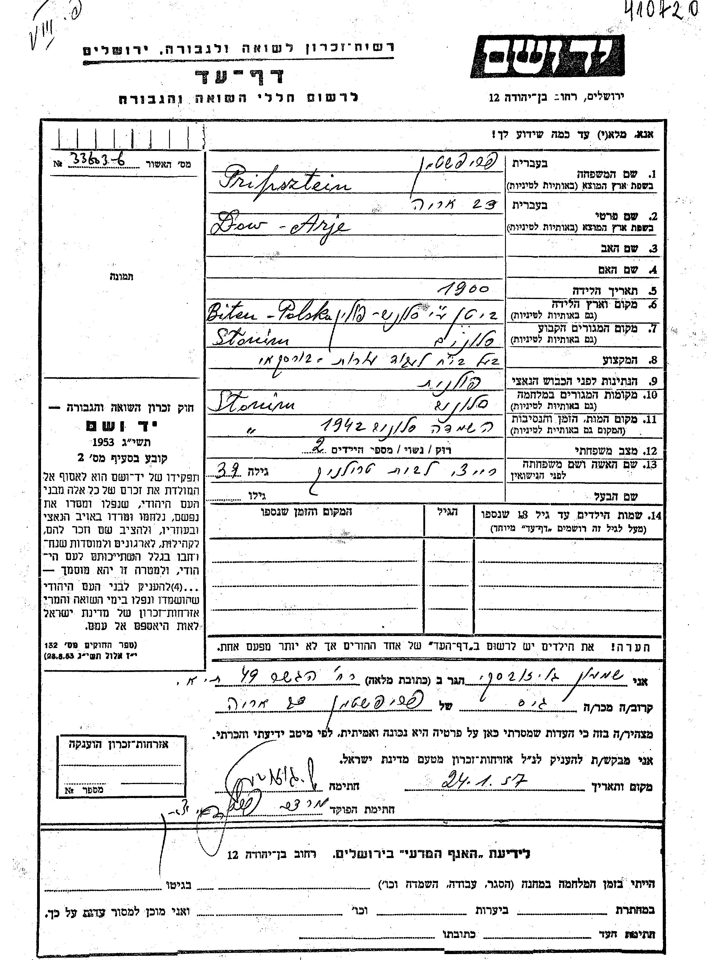 Dow Arje Prifsztein wurde im Jahr 1900 in Biten, Polen geboren. Er war mit Reitzi, geb. Trilnik Verheiratet. Vor dem Zweiten Weltkrieg lebte er in Slonim, Polen. Während des Krieges war er in Slonim, Polen.