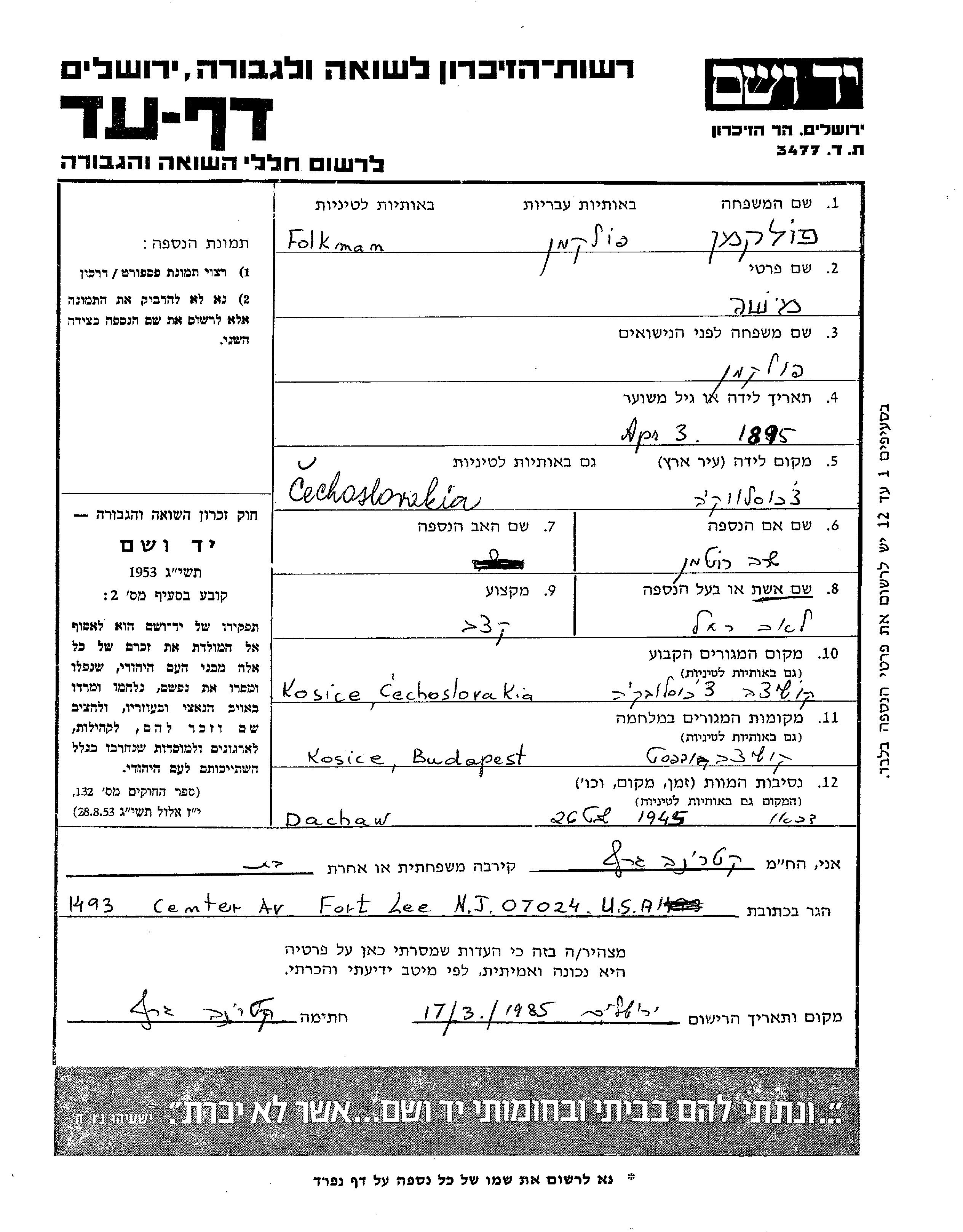 Moshe Folkman wurde im Jahr 1895 in Tschechoslowakei geboren. Er war der Sohn von Sara. Er war Metzger/-in und mit Rakhel, geb. Leb Verheiratet. Vor dem Zweiten Weltkrieg lebte er in Kosice, Tschechoslowakei. Während des Krieges war er in Budapest, Ungarn.
