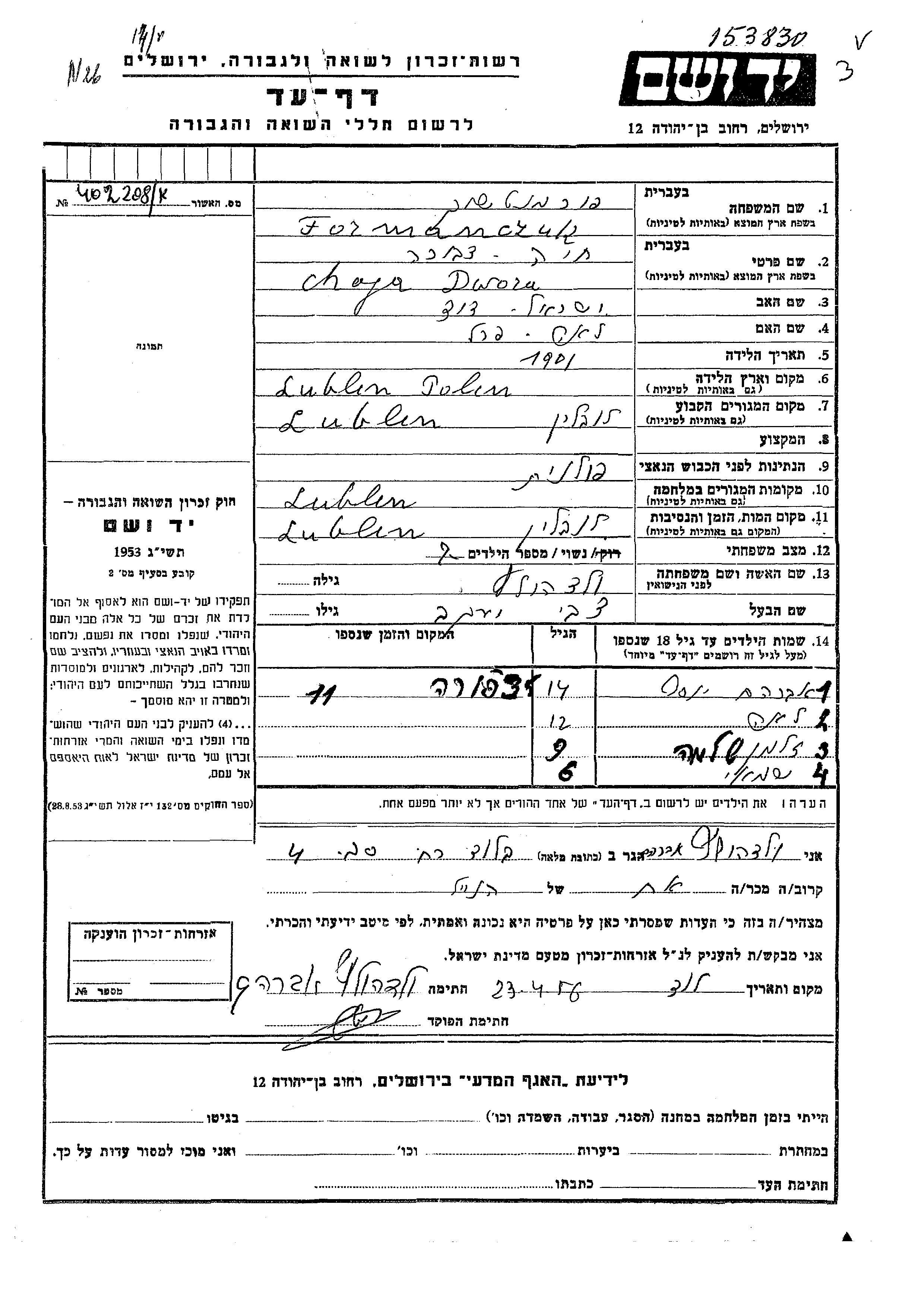 Chaja Dwora Formanczuk, geb. Valdholtz wurde im Jahr 1901 in Lublin, Polen geboren. Sie war die Tochter von Yisrael David und Lea Perel. Sie war mit Tzvi Yaakov Verheiratet. Vor dem Zweiten Weltkrieg lebte sie in Lublin, Polen. Während des Krieges war sie in Lublin, Polen.
