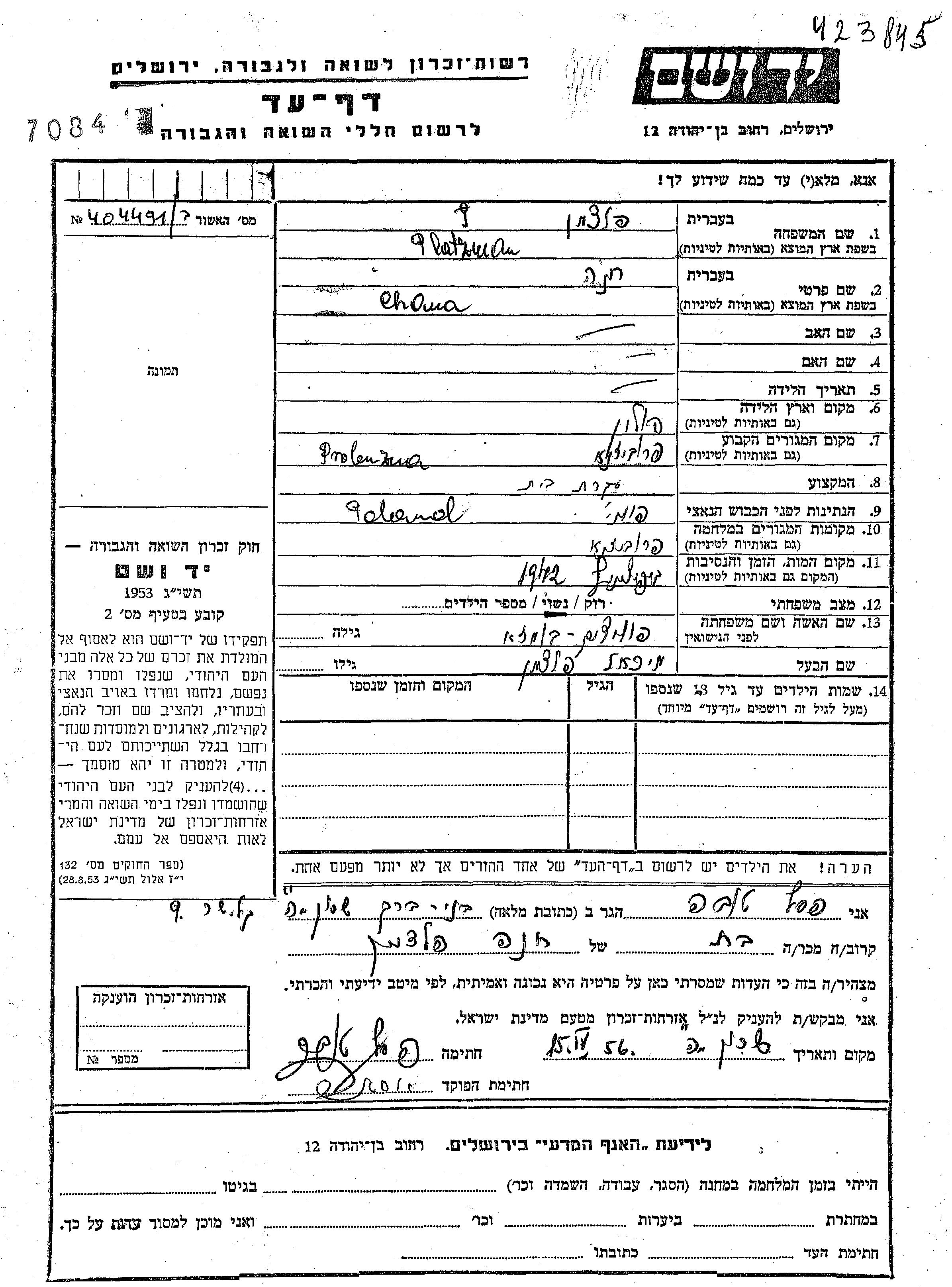 Chana Platzman Peltzman, geb. Polichuk wurde in Polen geboren. Sie war Hausfrau und mit Mikhael Verheiratet. Vor dem Zweiten Weltkrieg lebte sie in Probizhna, Polen. Während des Krieges war sie in Probizhna, Polen.