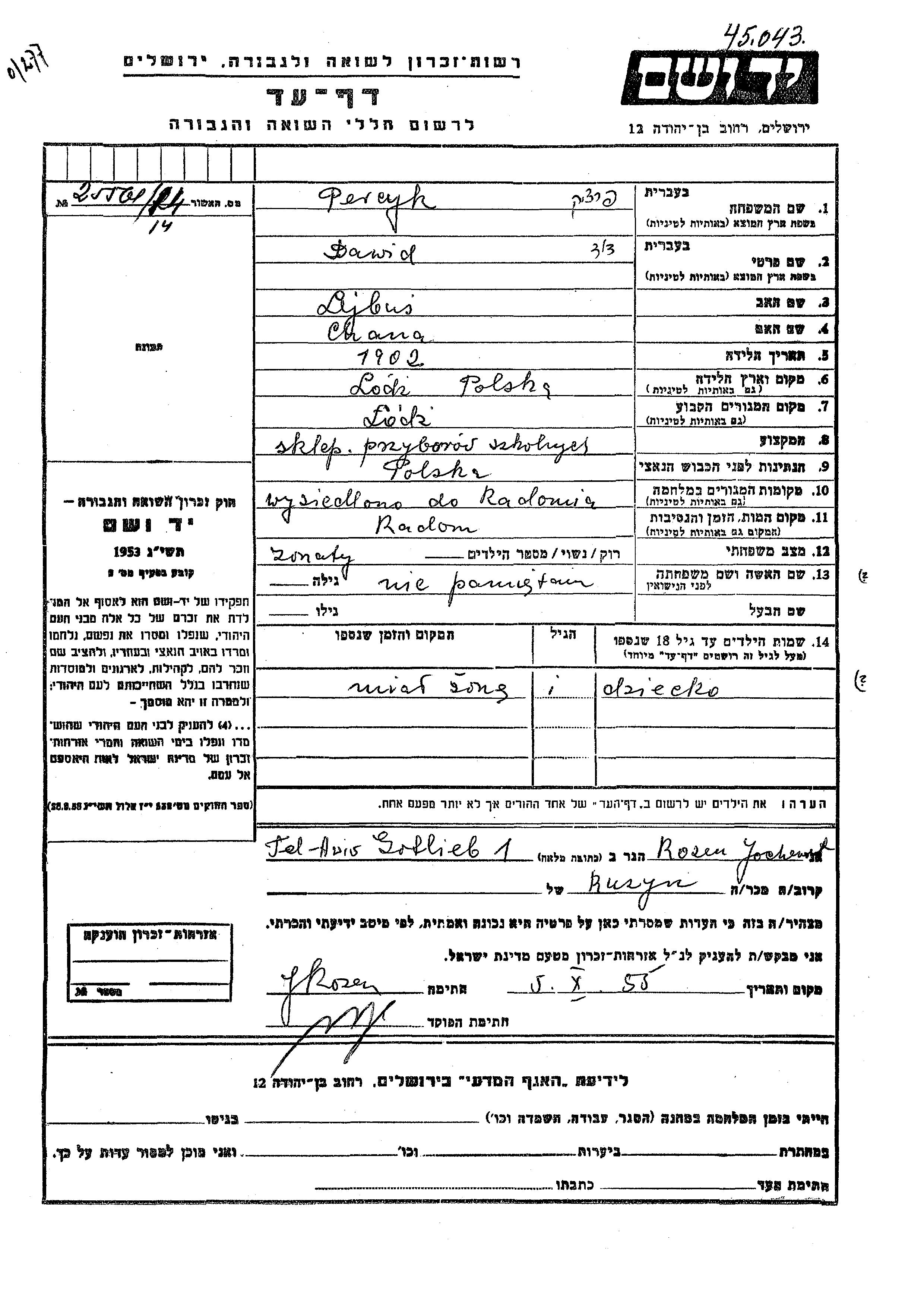 Dawid Percyk wurde im Jahr 1902 in Lodz, Polen geboren. Er war der Sohn von Lybus und Chana. Er war Sklep przyborow szkolnych und Verheiratet. Vor dem Zweiten Weltkrieg lebte er in Lodz, Polen. Während des Krieges war er in Radom, Polen.