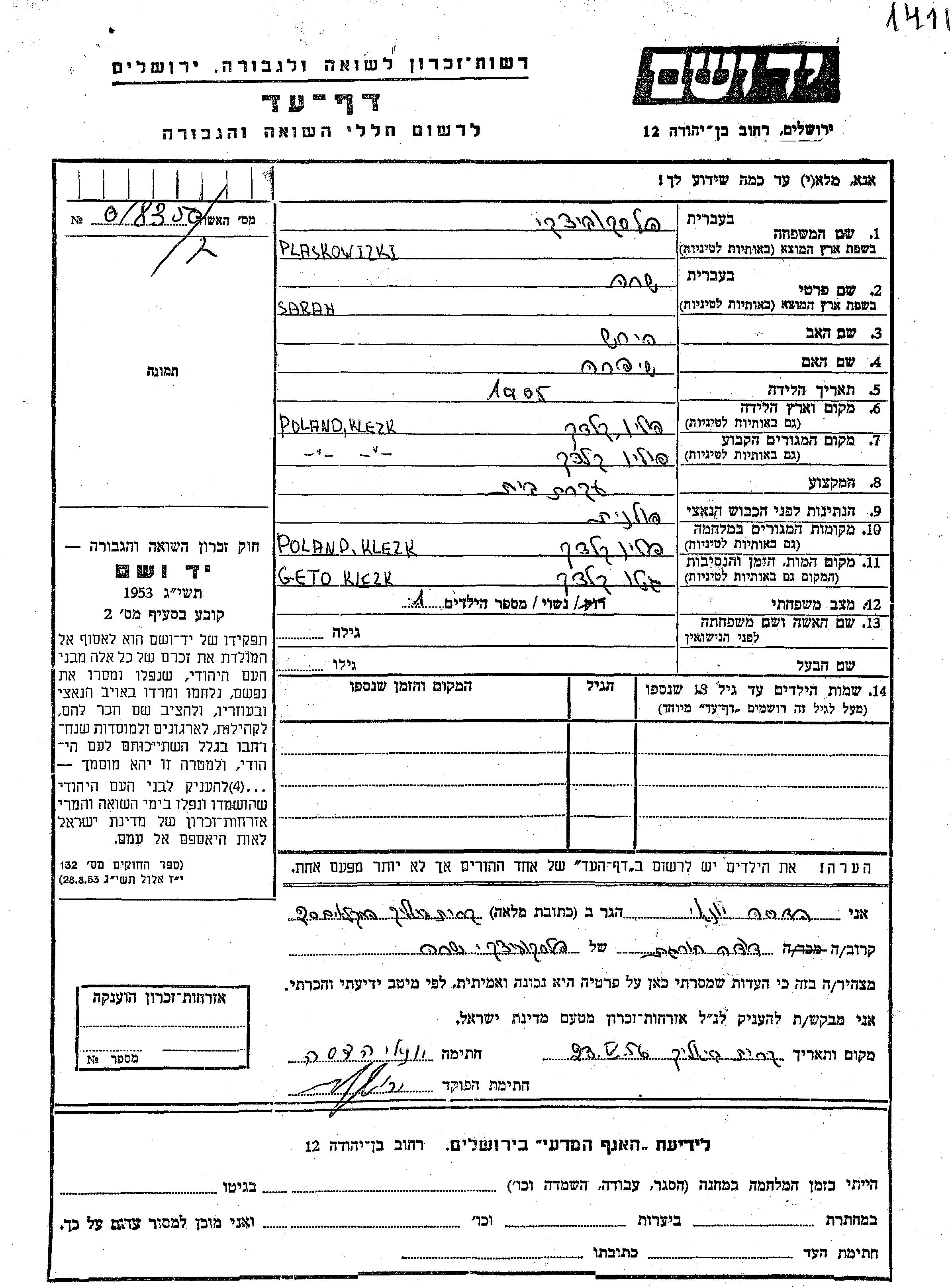 Sarah wurde in der Schoah ermordet. Todesort: Klezk, Polen.