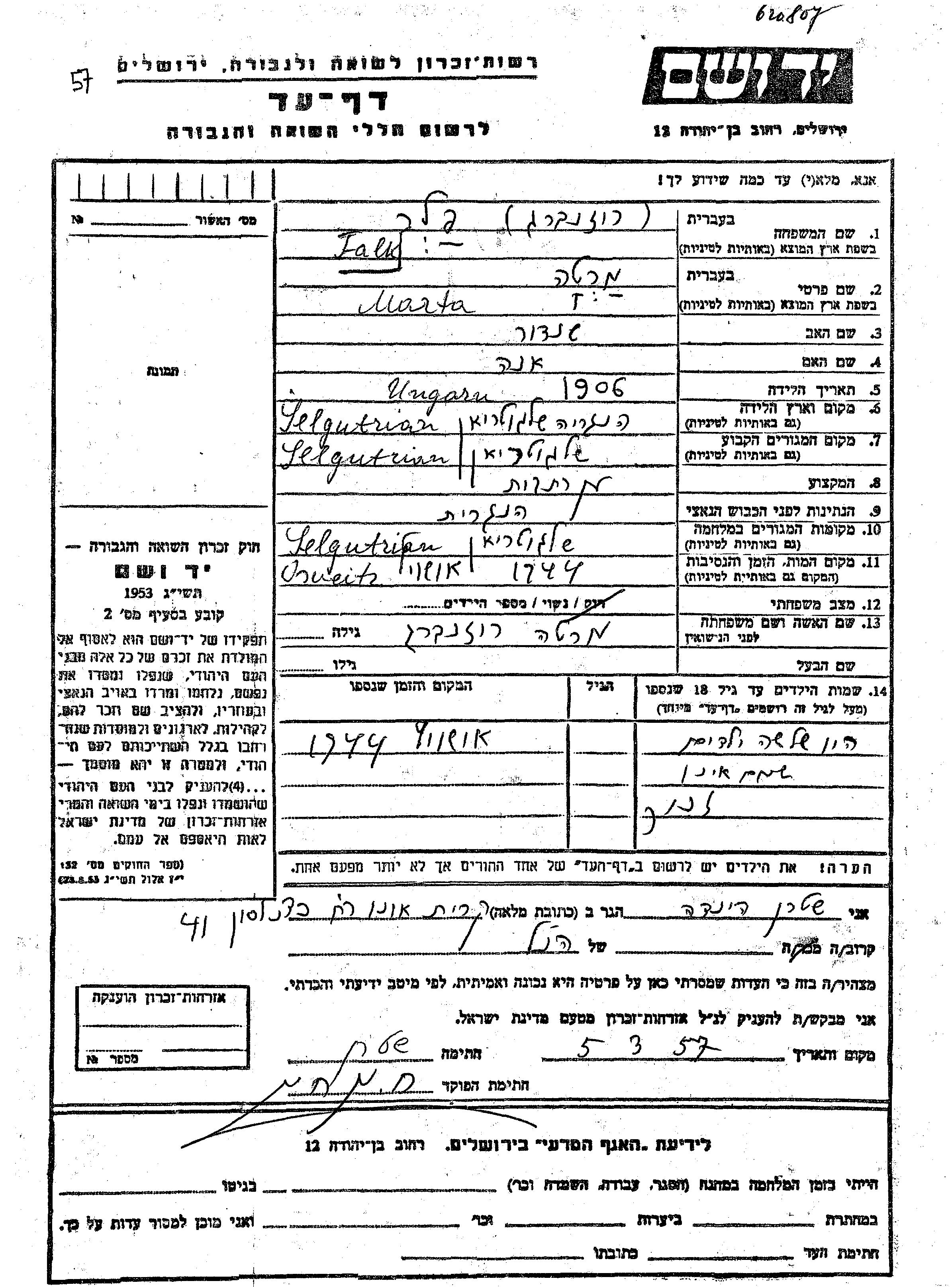 Marta Falk, geb. Rozenberg wurde im Jahr 1906 in Selgotarjan, Ungarn geboren. Sie war die Tochter von Sandor und Ana. Sie war Hausfrau und Verheiratet. Vor dem Zweiten Weltkrieg lebte sie in Selgotarjan, Ungarn. Während des Krieges war sie in Selgotarjan, Ungarn.