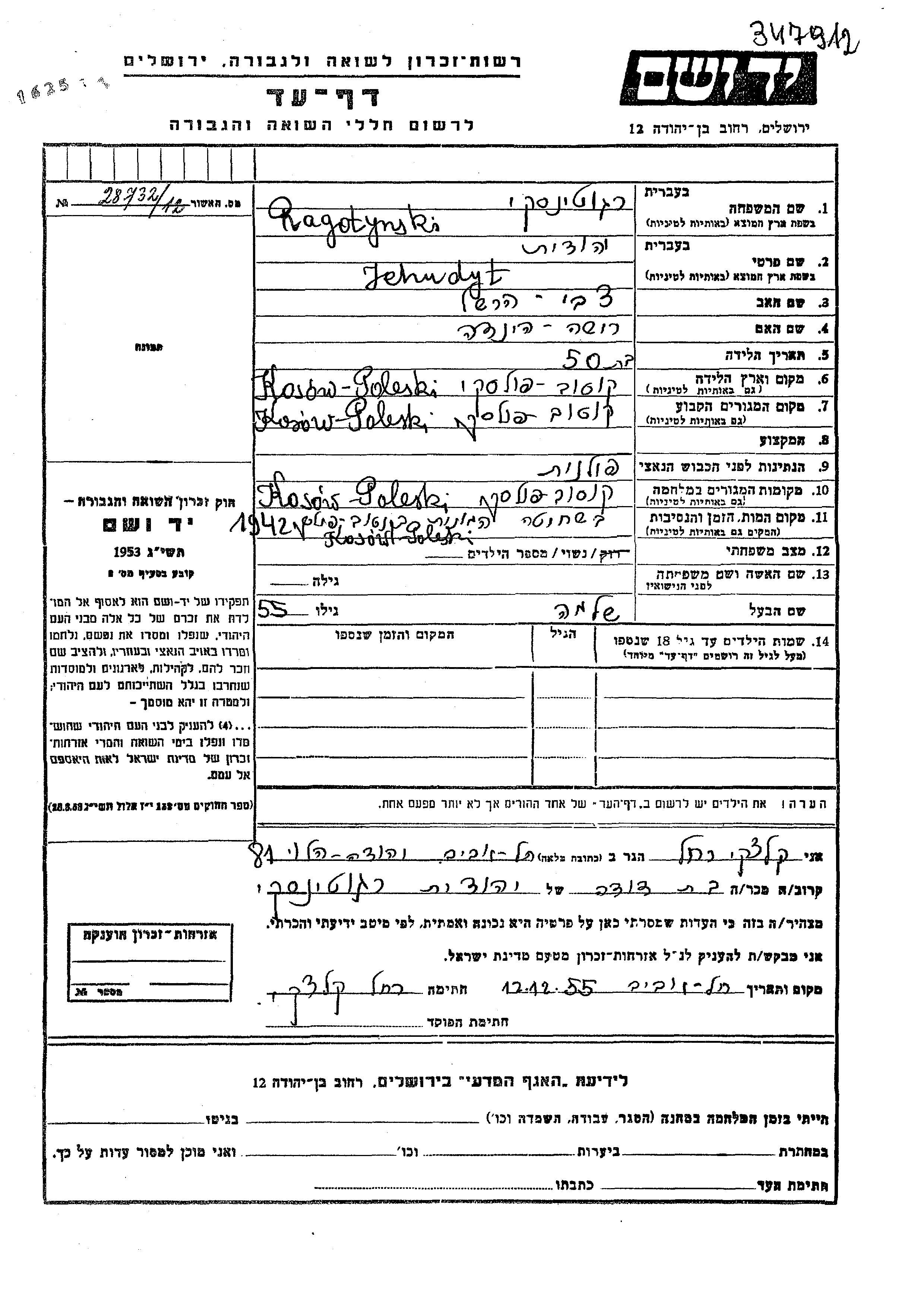 Jehudyt Ragotynski wurde in Kosow Poleski, Polen geboren. Sie war die Tochter von Tzvi Hershel und Rosha Hinda. Sie war mit Shlomo Verheiratet. Vor dem Zweiten Weltkrieg lebte sie in Kosow Poleski, Polen. Während des Krieges war sie in Kosow Poleski, Polen.