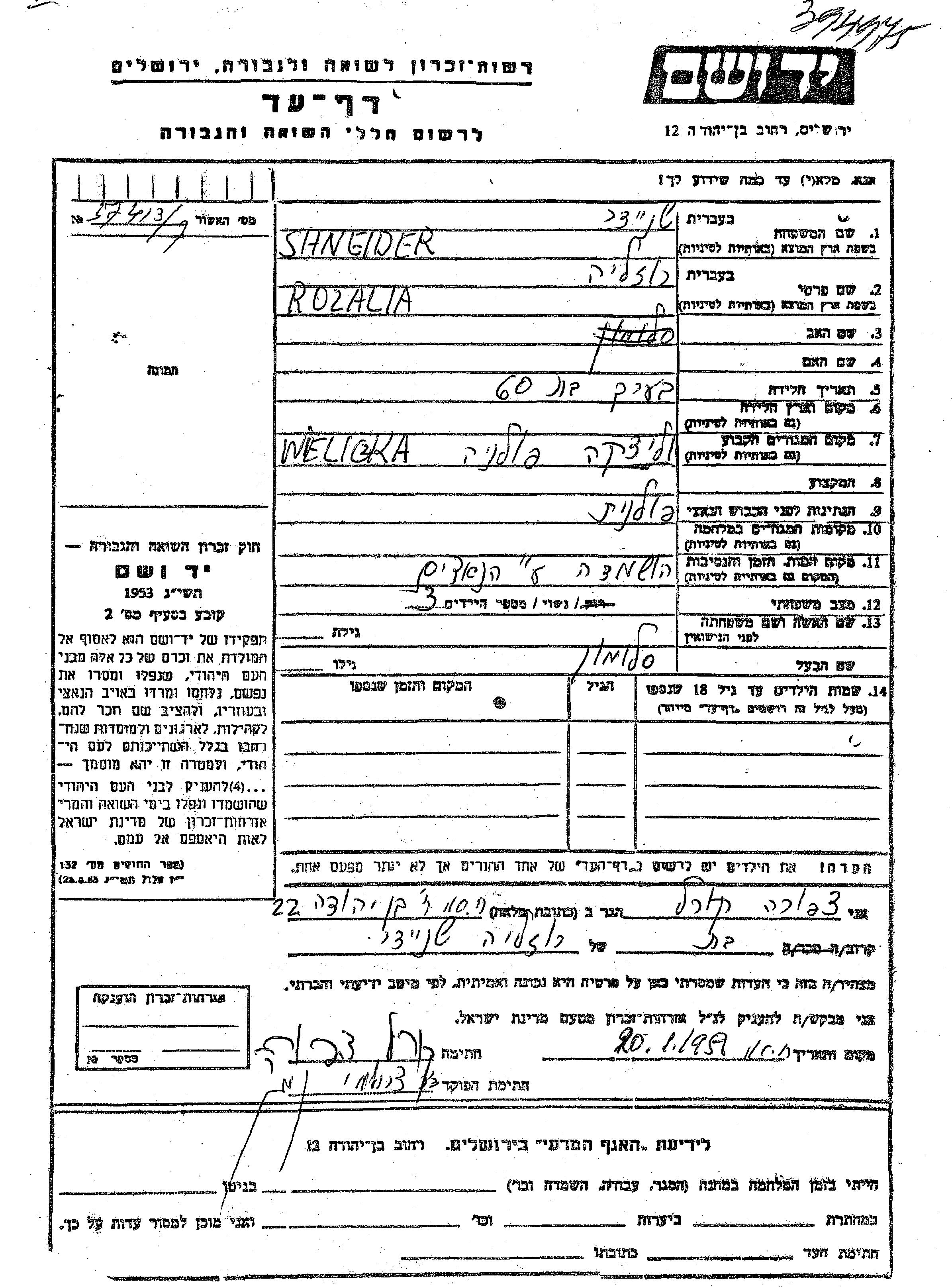 Rozalia Shneider. Sie war mit Salomon Verheiratet. Vor dem Zweiten Weltkrieg lebte sie in Welicka, Polen.