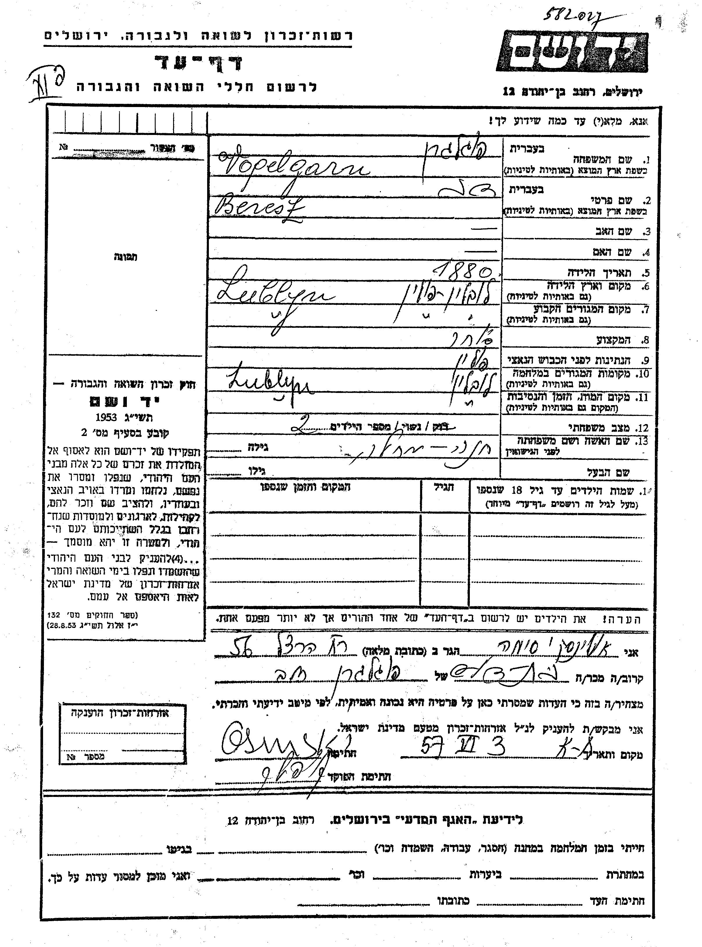 Beresz Dov Vopelgarn wurde im Jahr 1880 in Lublin, Polen geboren. Er war Kaufmann/-frau und mit Khana Makhla Verheiratet. Vor dem Zweiten Weltkrieg lebte er in Lublin, Polen. Während des Krieges war er in Lublin, Polen.