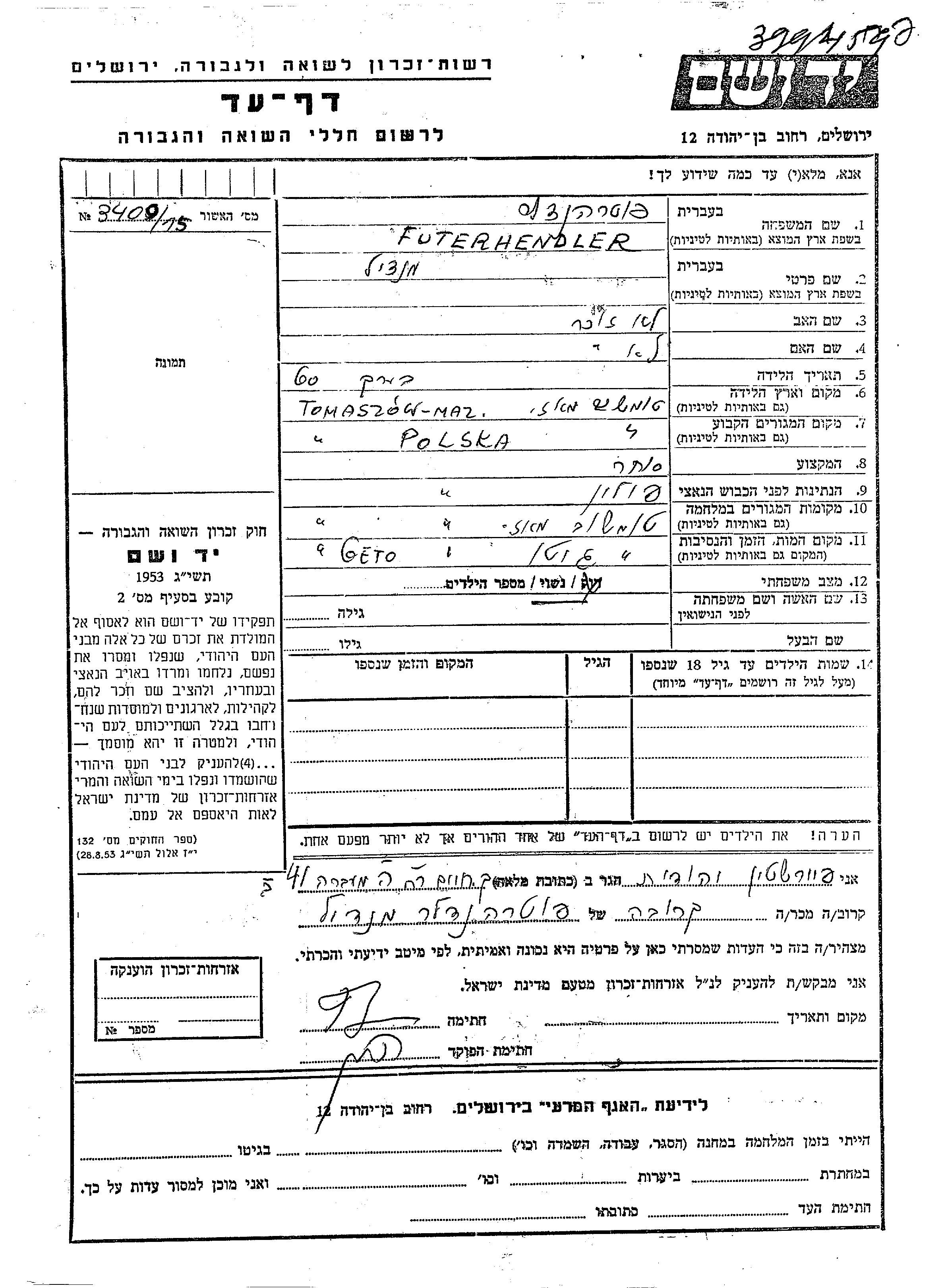 Mendil Futerhendler wurde in Tomaszow Mazowieckie, Polen geboren. Er war Kaufmann/-frau und Verheiratet. Vor dem Zweiten Weltkrieg lebte er in Tomaszow Mazowieckie, Polen. Während des Krieges war er in Tomaszow Mazowieckie, Polen.