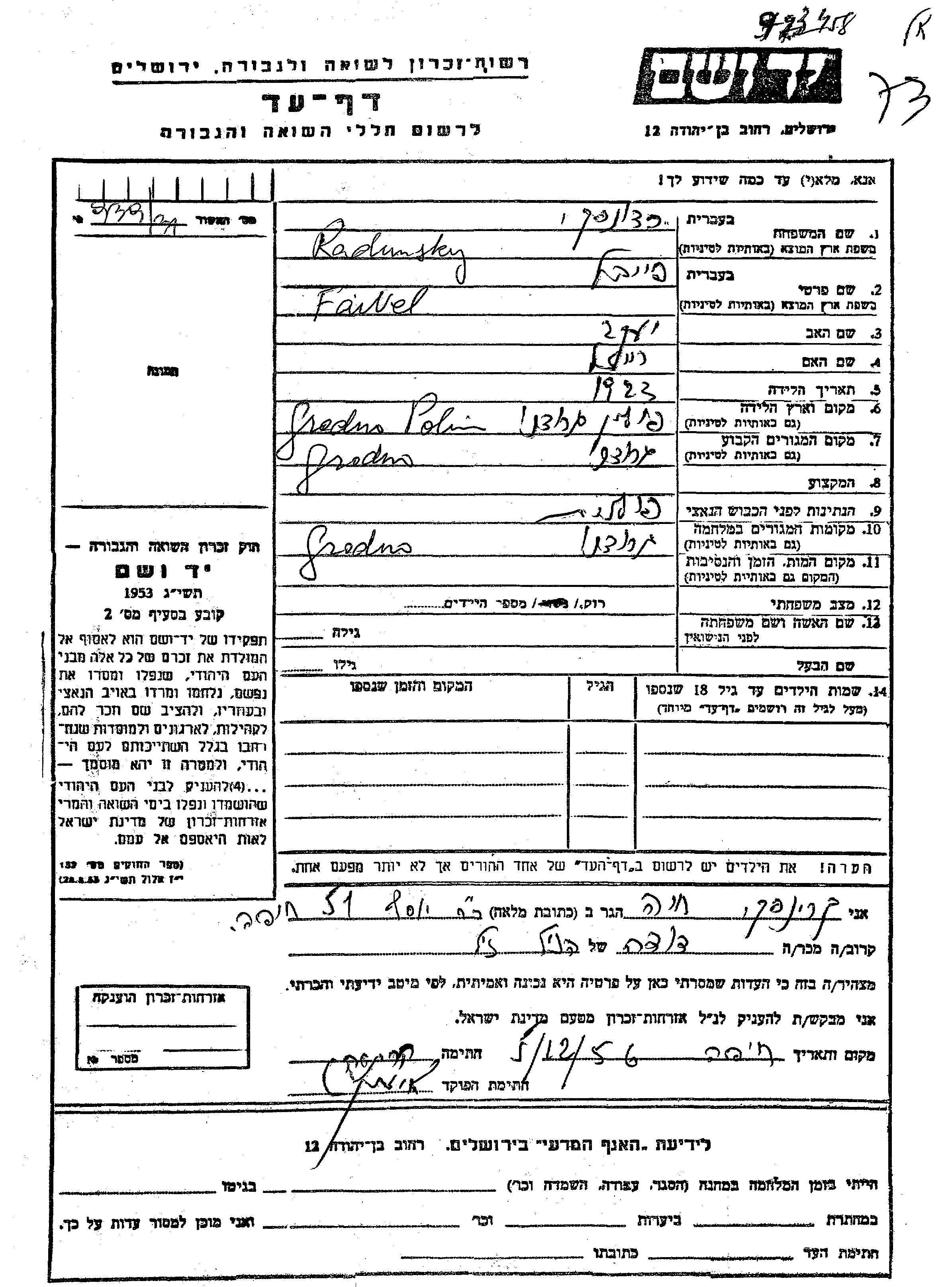Faivel Radunsky wurde im Jahr 1923 in Grodno, Polen geboren. Er war der Sohn von Yaakov und Reizl. Er war Ledig. Vor dem Zweiten Weltkrieg lebte er in Grodno, Polen. Während des Krieges war er in Grodno, Polen.
