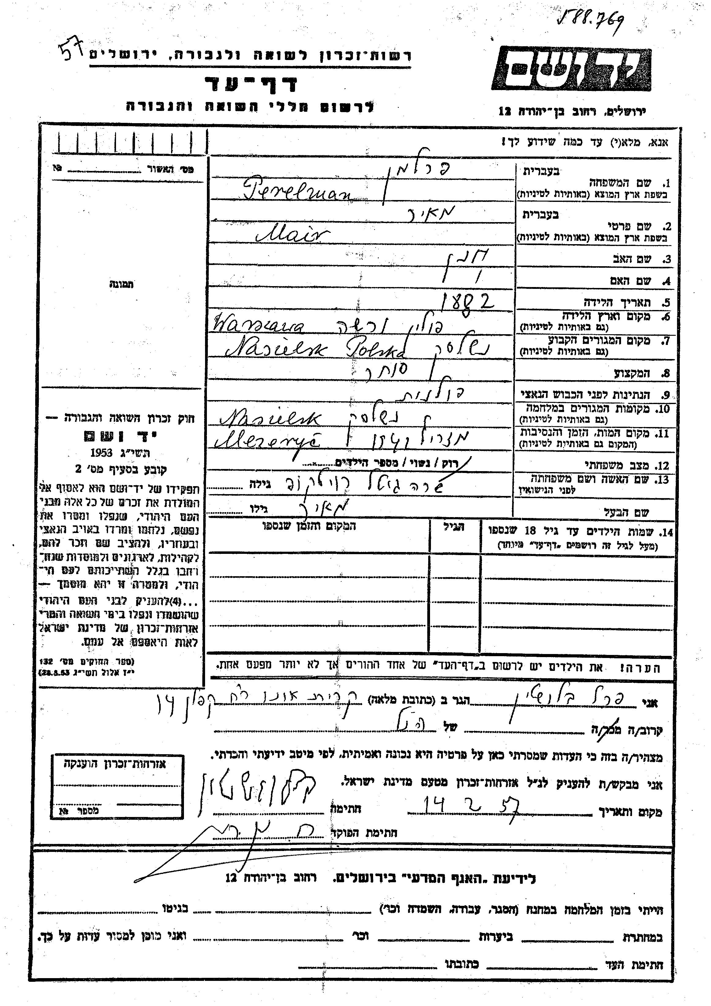 Mair Perelman wurde im Jahr 1882 in Warszawa, Polen geboren. Er war der Sohn von Khanan. Er war Kaufmann/-frau und mit Sara Gitel, geb. Roitkop Verheiratet. Vor dem Zweiten Weltkrieg lebte er in Nasielsk, Polen. Während des Krieges war er in Nasielsk, Polen.