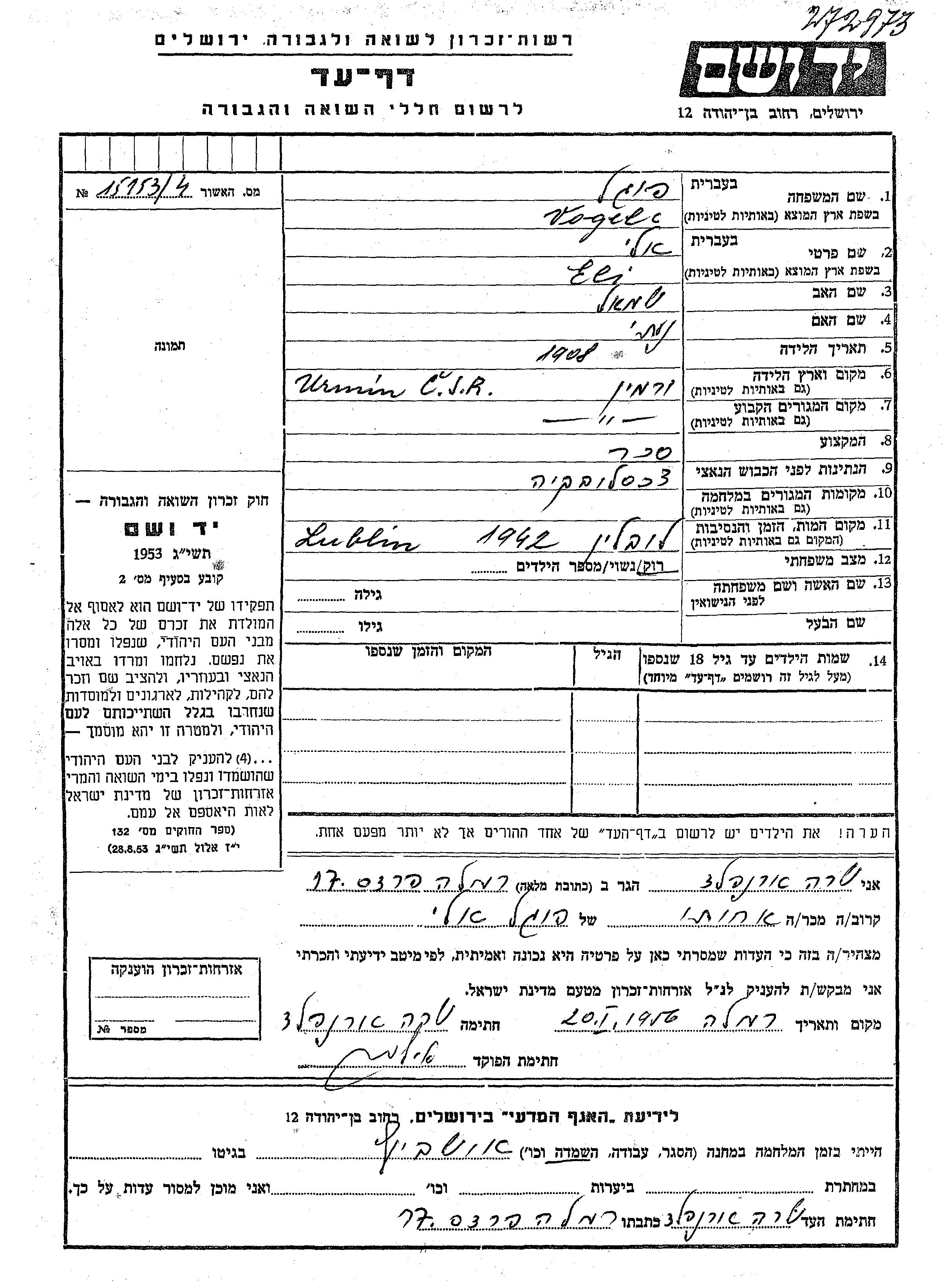 Eli Vogel wurde im Jahr 1908 in Urmin, Tschechoslowakei geboren. Er war der Sohn von Shmuel und Naomi. Er war Kaufmann/-frau und Ledig. Vor dem Zweiten Weltkrieg lebte er in Urmin, Tschechoslowakei.