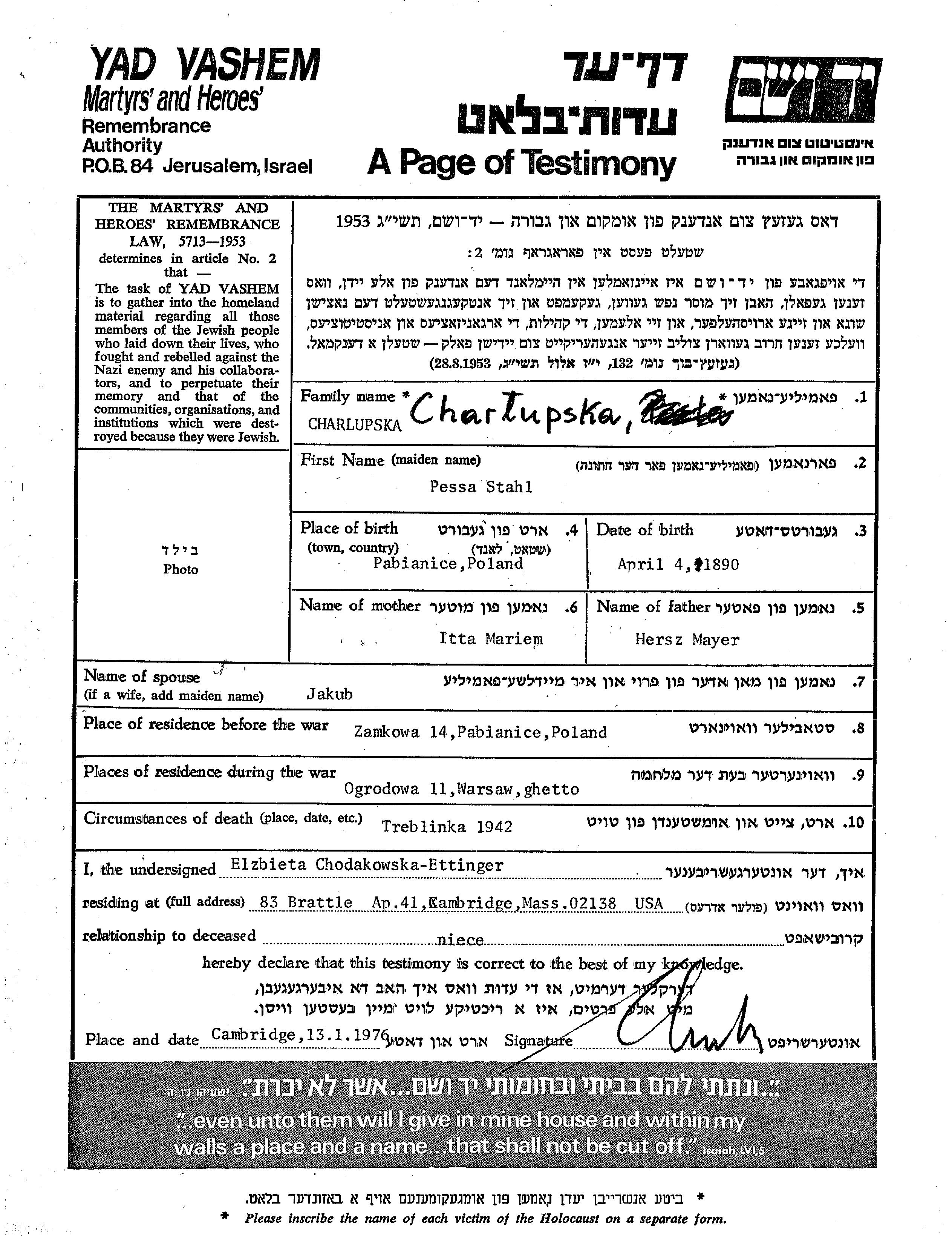 Pessa Charlupska, geb. Stahl wurde im Jahr 1890 in Pabianice, Polen geboren. Sie war die Tochter von Hersz Mayer und Itta Mariem. Sie war mit Jakub Verheiratet. Vor dem Zweiten Weltkrieg lebte sie in Pabianice, Polen. Während des Krieges war sie in Warszawa, Polen.